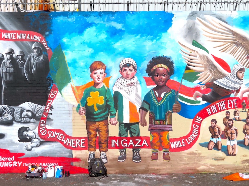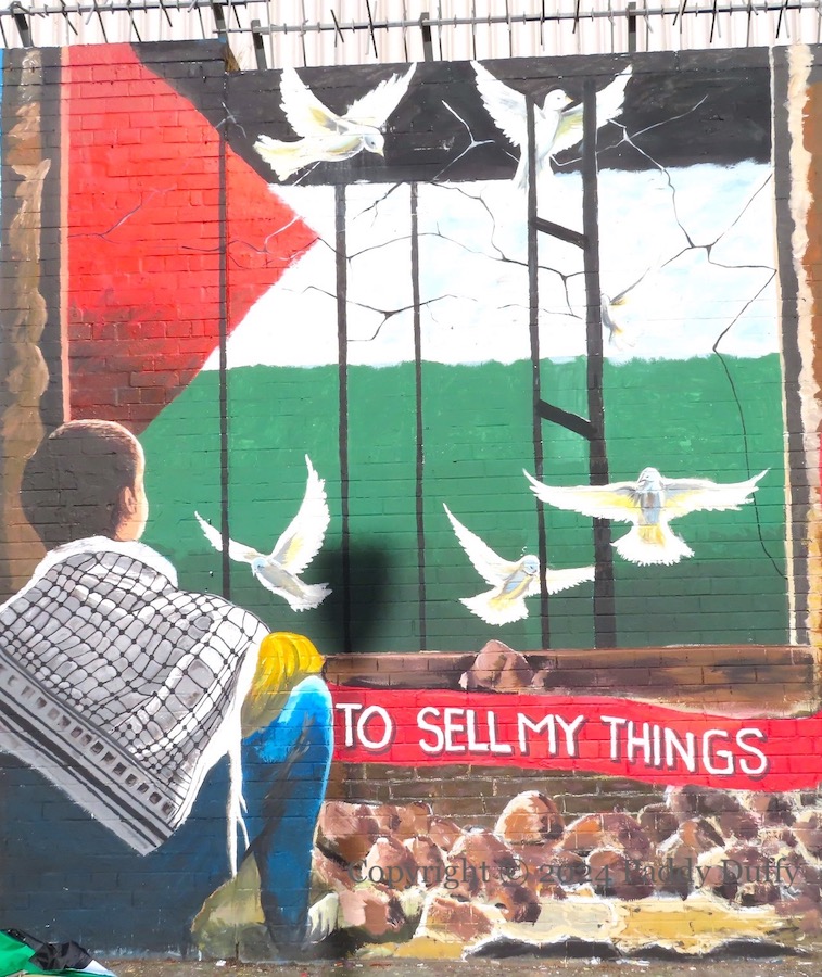 For the launch of the murals painted in the Painting For Palestine project (Fb) a red ribbon with the words from Palestinian writer Refaat Alareer’s poem “If I Must Die” was added to the ten consecutive panels below the ‘republican museum’ panel.