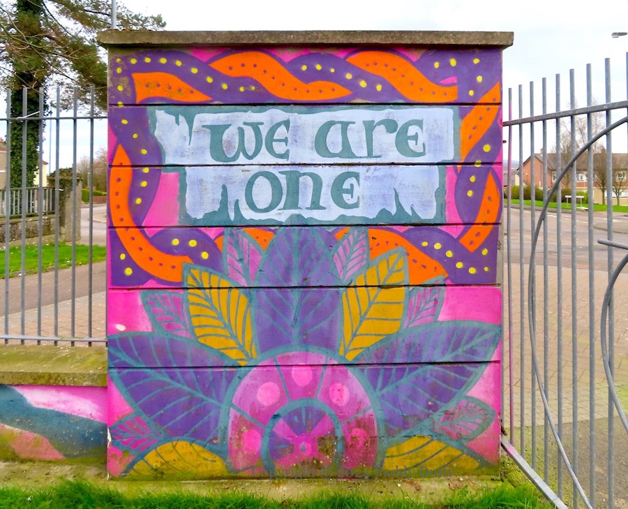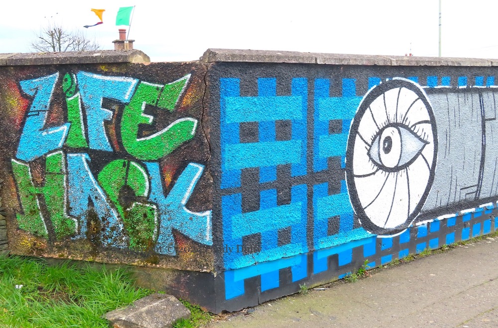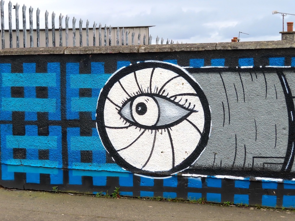Life Hack (Xitter) is a youth project in Creggan, Derry, based in the Ráth Mór centre on Bligh’s Lane. In addition to this long telescoping eye around the Westway Roundabout (with Peaball (ig)), its members were also involved in painting the pillars at the lower entrance to Bishop’s Field/Gort An Easpaıg – see the final image, below.