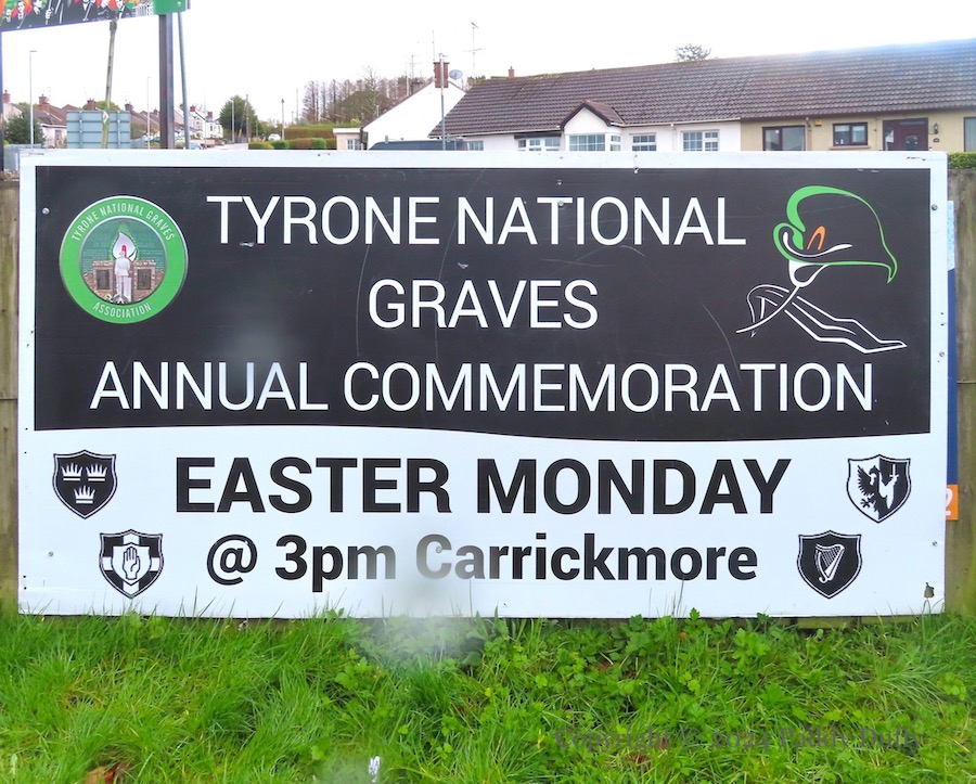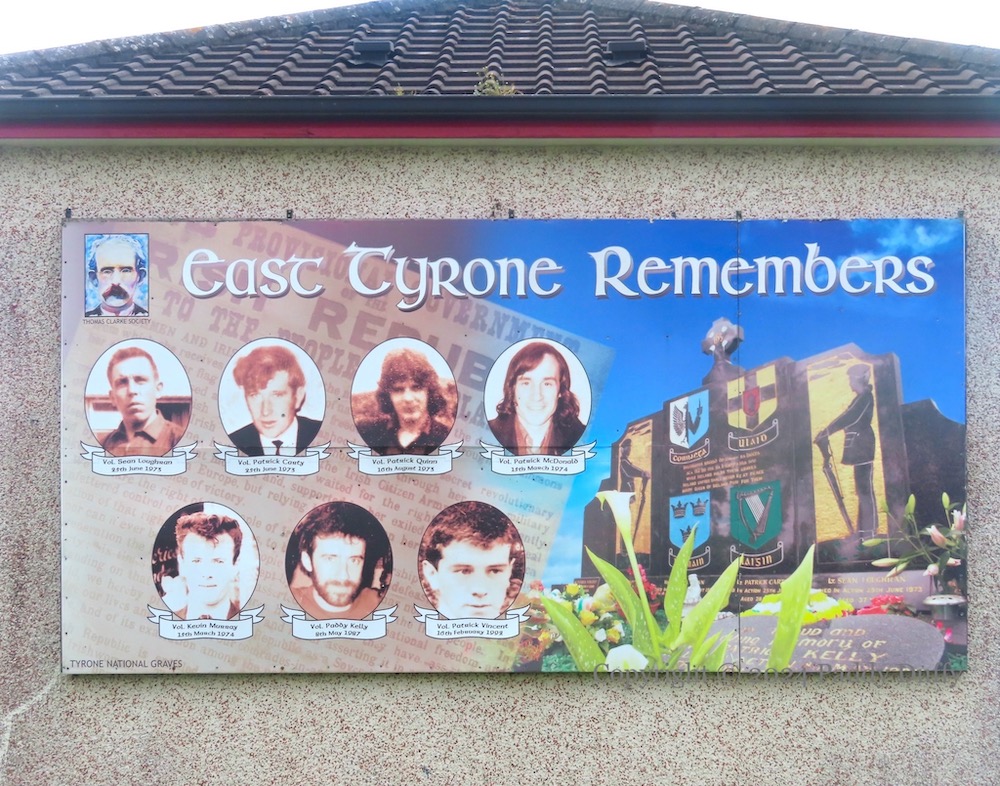 The ‘East Tyrone Remembers’ board to IRA volunteers Sean Loughran, Patrick Carty, Patrick Quinn, Patrick McDonald, Kevin Murray, Paddy Kelly, Patrick Vincent – either this one exactly or a re-print of it – is mounted periodically. It first appeared in 2010 to be replaced by the Clonoe Martyrs. It was back again in 2013 and has been in place since 2017.