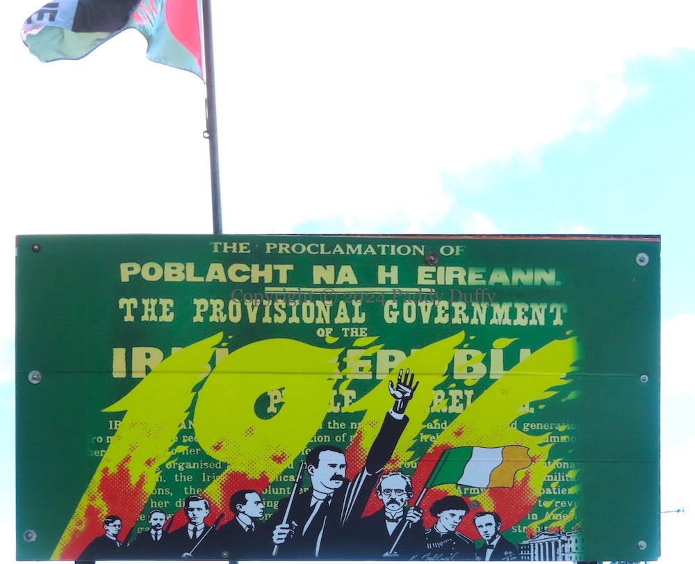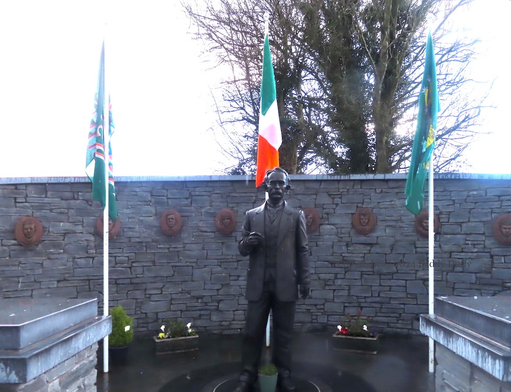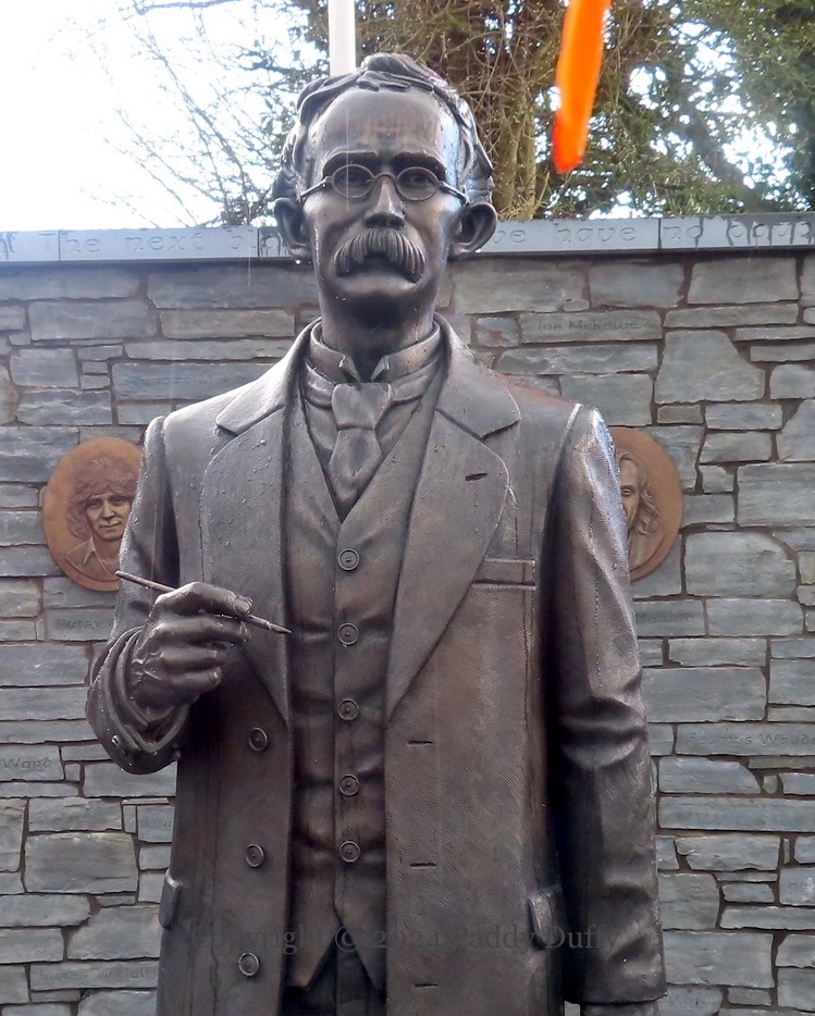 Thomas Clarke/Tomás Ó Cléırıgh (b. 1858) has a long career in Irish fenianism, including fleeing to America after firing at police (at age 20) and 15 years of hard labour for an attempted bombing in London, beginning in 1883 (DIB). He is best known for his role, along with Sean Mac Dıarmada (The Mainspring), as architect of the Easter Rising. He is particularly honoured in Dungannon, where he grew up from the age of nine onward, the last posting of his British-Army–sergeant father. This statue in the Lisnahull area was unveiled (in this location) in late November 2021 (We Are Tyrone | NI World).