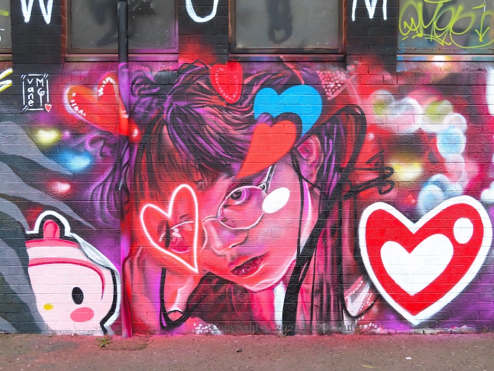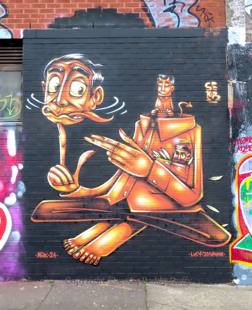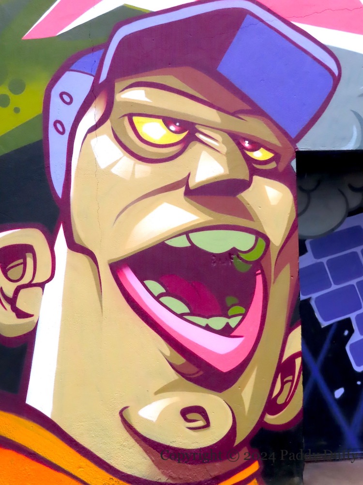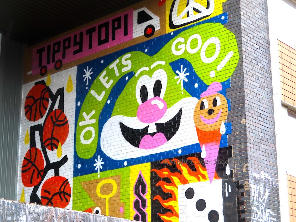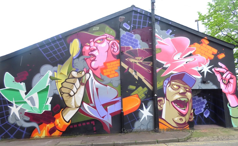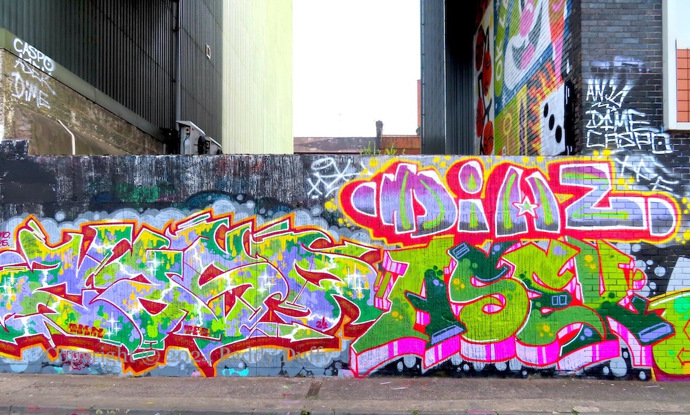 Here is a gallery of the new street art from Kent street above Union Street and on the north side of Kent Street below Union Street, painted for 2024’s Hit The North festival. For the south side of Kent Street, see Happy Accidents.
