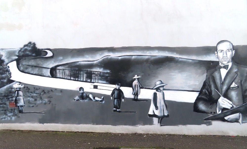 Francis “Frank” McKelvey grew up at 56 Woodvale Road (based on Lennon Wylie and the blue plaque on the wall at this address – Street View). That would put him a stone’s throw from Woodvale Park, which provides the backdrop for this new mural at the end of Woodvale Street. The photograph reproduced, of “Woodvale park pond”, can be seen on the Old Shankill Fb page. The pond was filled in after the second World War (City Council). McKelvey’s ‘A Summer’s Day‘ is perhaps of Woodvale Park pond. He died in 1974 (Ulster History Circle).