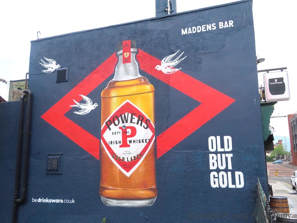 The mural on the wall of Madden’s bar in the city centre has been updated. Fiddler Art Lundy and the “decommissioned” ashtray are retained, but much else has changed. (For the previous version, see Madden’s.)