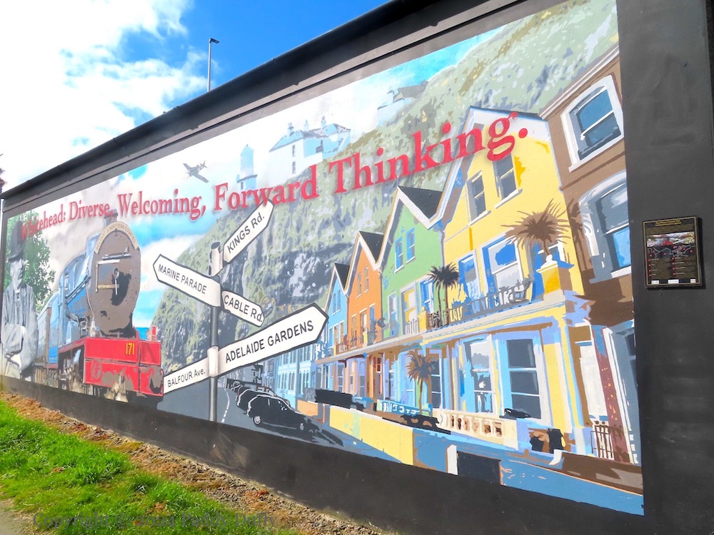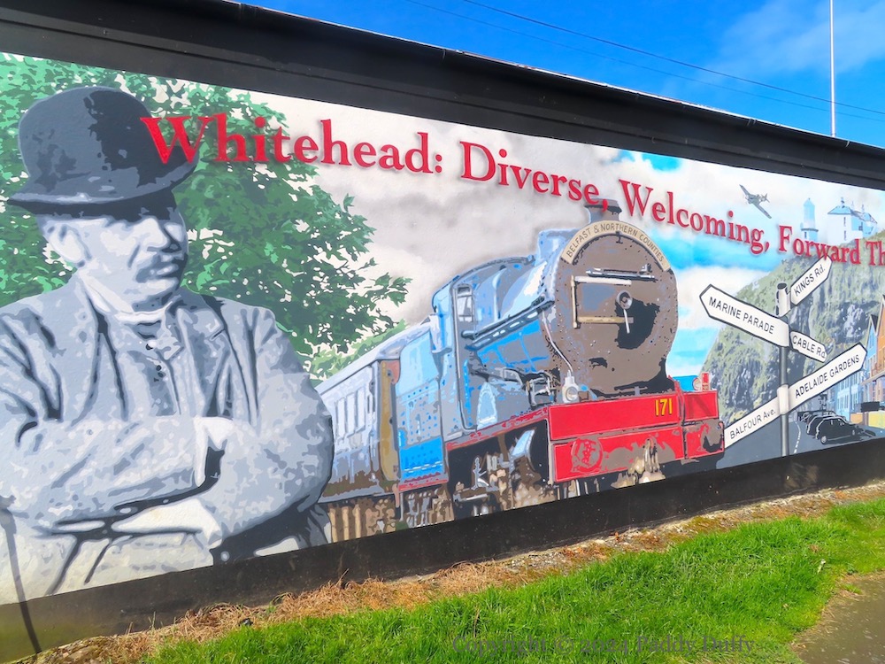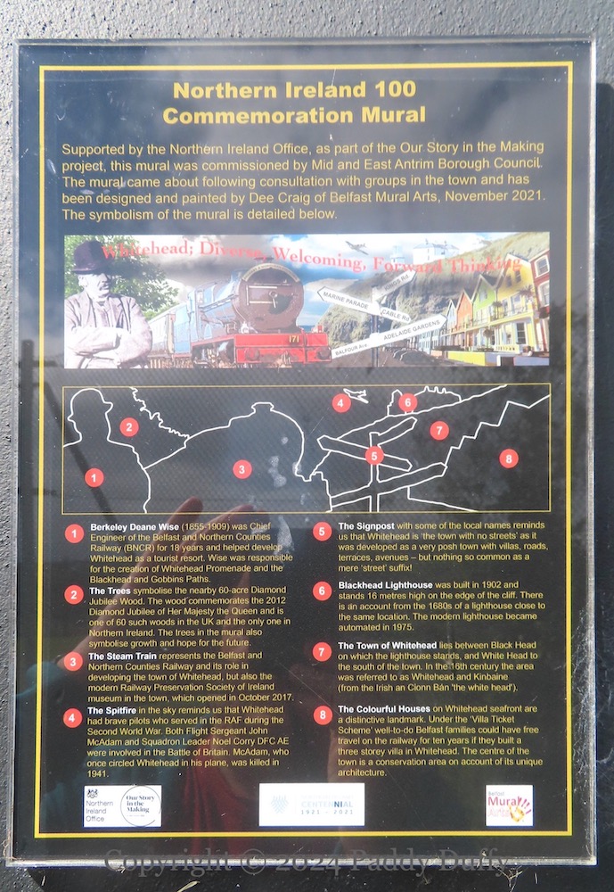“Whitehead: Diverse, Welcoming, Forward Thinking – Northern Ireland 100 Commemoration Mural – Supported by the Northern Ireland Office, as part of the Our Story In The Making project, this mural was commissioned by Mid And East Antrim Borough Council. The mural came about following consultation with groups in the town and has been designed and painted by Dee Craig of Belfast Mural Arts, November 2021. The symbolism of the mural is detailed below … Berkeley Deane Wise … The Trees … The Steam Train … The Spitfire … The Signpost … Blackhead Lighthouse … The Town Of Whitehead … The Colourful Houses …”