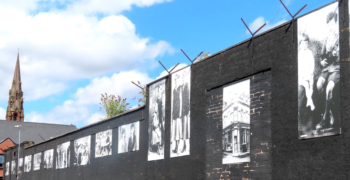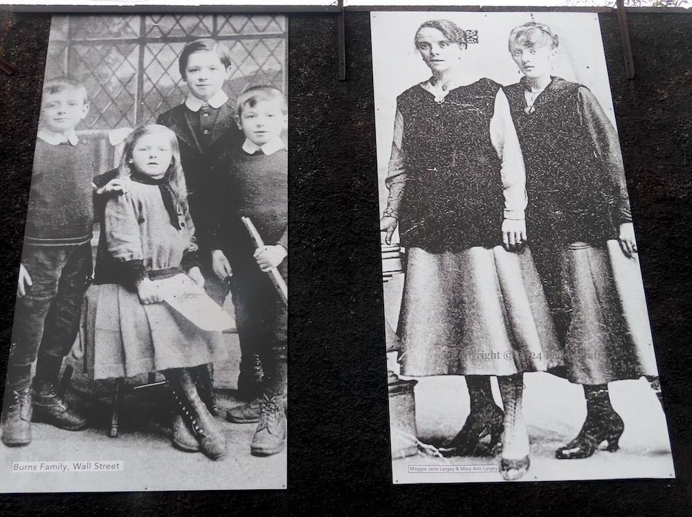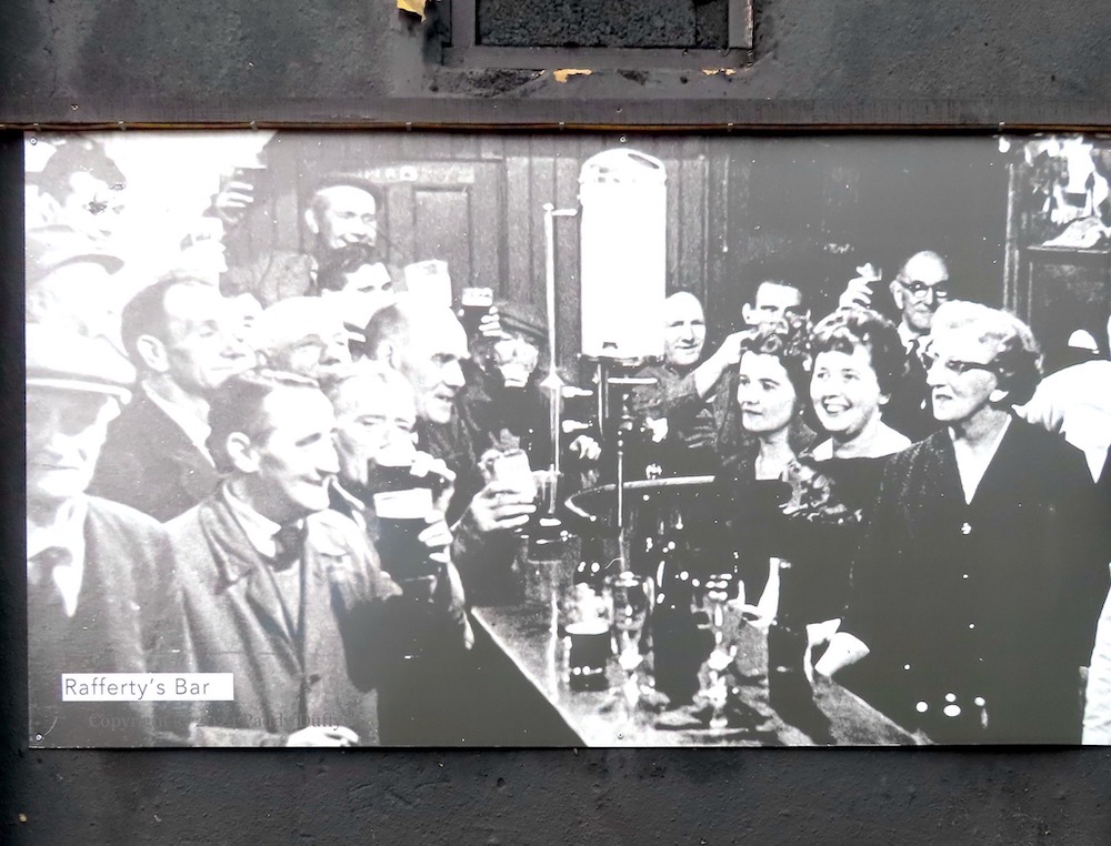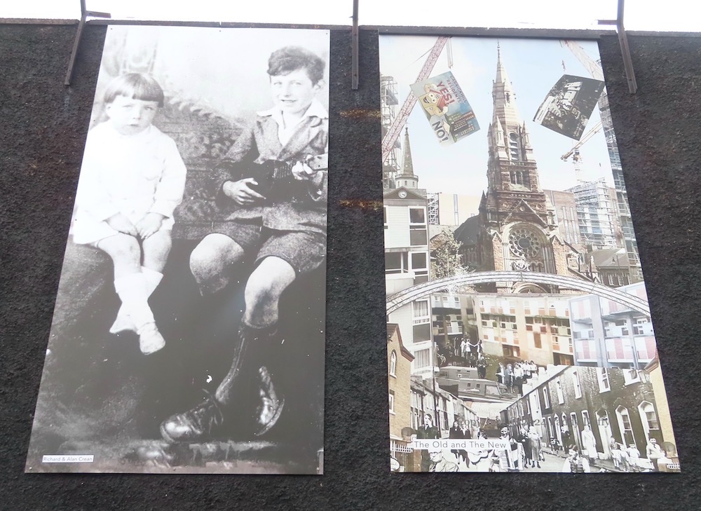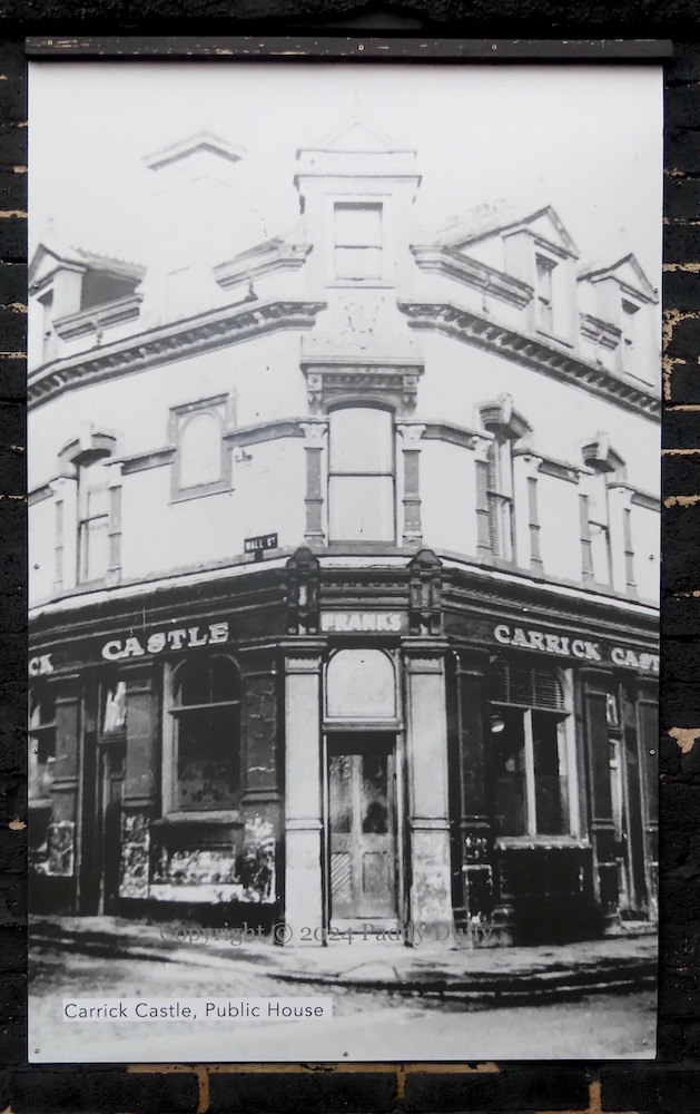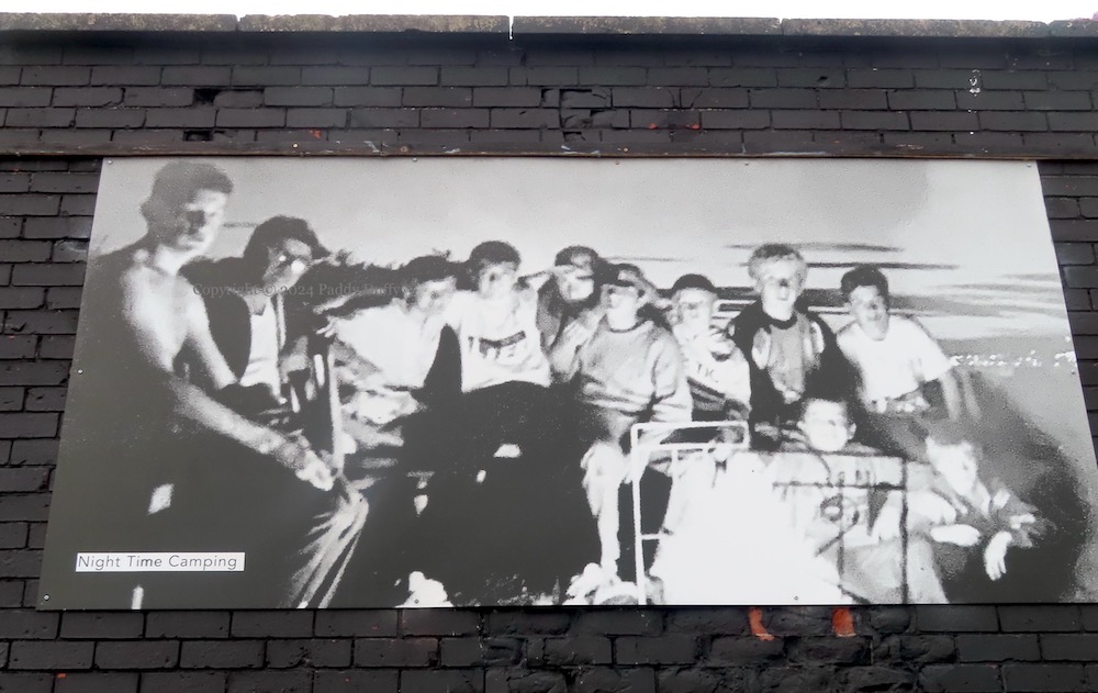 The entry Old Carrick Hill shows the mural of ‘Carrick Hill in yesteryear’ from Stanhope Street. Around the corner in Regent Street there are the fifteen printed boards shown here. From left to right (top to bottom in this entry) they depict … Park Street; Rafferty’s Bar; The Tea Bar, Carrick House; Unity Flats; Alton Utd, FC (founded in 1921, played in the Falls League, won the 1923 Free State Cup Final – Bohs Sporting Life); All in a day’s outing; Playing marbles; Night-time camping; 1976 Mandiville dart team; Mary McCusker & Kitty Spotwoods; Burns family, Wall Street; Maggie Jane Largey & Mary Ann Largey; Carrick Castle public house; Richard & Alan Crean; The Old & The New.