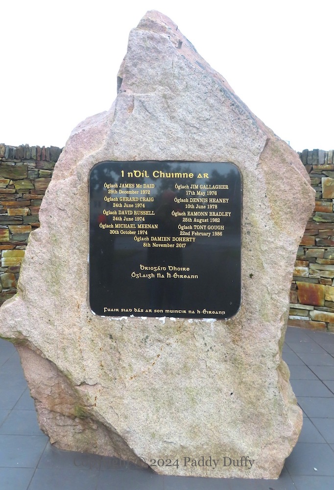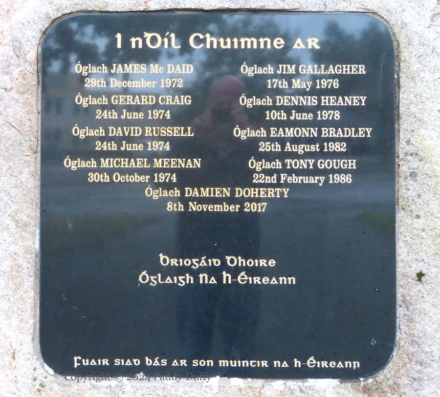 Seven members of the Derry Brigade are listed on the central stone: Junior McDaid, Gerard Craig, David Russell, Michael Meenan, Jim Gallagher, Dennis Heaney, Bronco Bradley, Tony Gough, and (a new addition compared to 2003) Damien Doherty. “Fuaır sıad bás ar son muıntır na hÉıreann”.