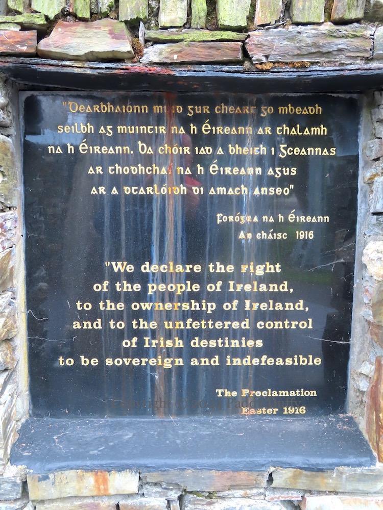 “Dearbhaıonn muıd gur cheart go mbeadh seılbh ag muıntır na hÉıreann ar thalamh na hÉıreann. Ba chóır ıad a bheıth ı gceannas ar thodhchaí na hÉıreann agus ar a dtarlóıdh dı amach anseo – Forógra na hÉıreann, An Cháısc 1916” – “We declare the right of the people of Ireland, to the ownership of Ireland, and to the unfettered control of Irish destinies to be sovereign and indefeasible – The Proclamation, Easter 1916”