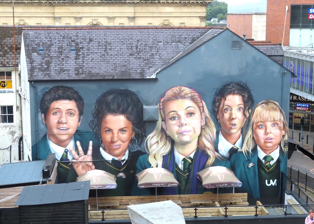 The Derry Girls, and the wee fella, James, are a tourist attraction, thanks to the success of the television show. The mural was updated in 2022 ahead of the third (and final) season, with Michelle holding up three fingers rather than two (compare with the image from 2020).