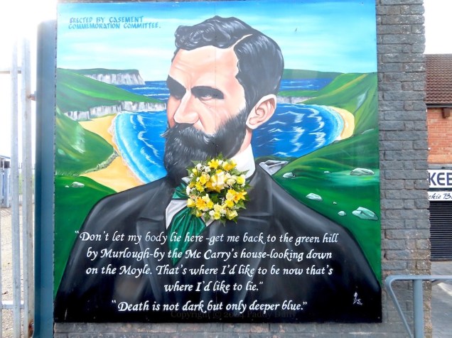 Casement’s preferred resting-place was Murlough Bay, as explained in the original entry for the painting on the other side of the gates showing Casement in front of Murlough Bay, included again below but here with a wreath of yellow flowers.