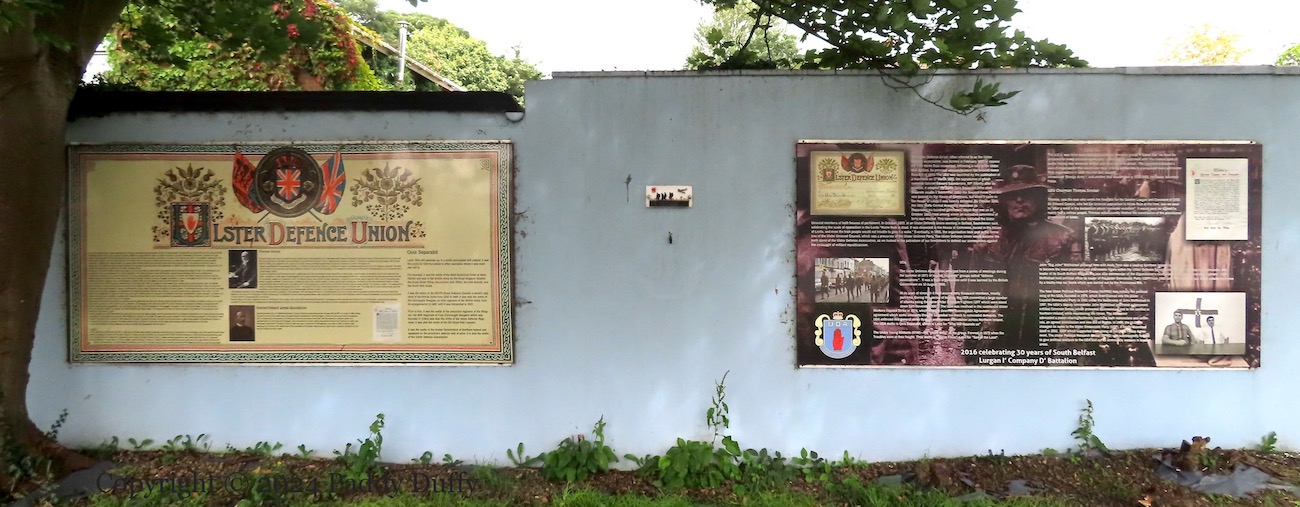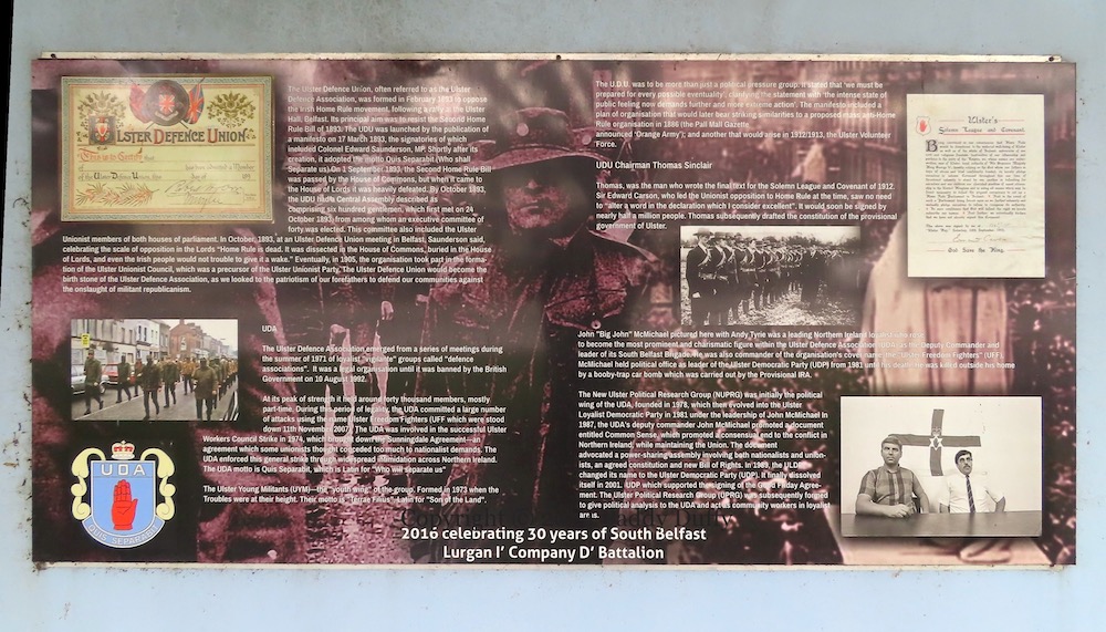 These are the UDA boards on Avenue Road, near Lurgan Park, which proved controversial when they were erected (in 2016), mainly because the second piece (below) “celebrat[es] 30 years of South Belfast/Lurgan 1 company D battalion” UDA and shows Troubles-era shows-of-strength (News Letter) and because it turned out the wall was owned by the Housing Executive (NIWorld).