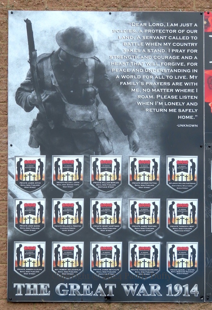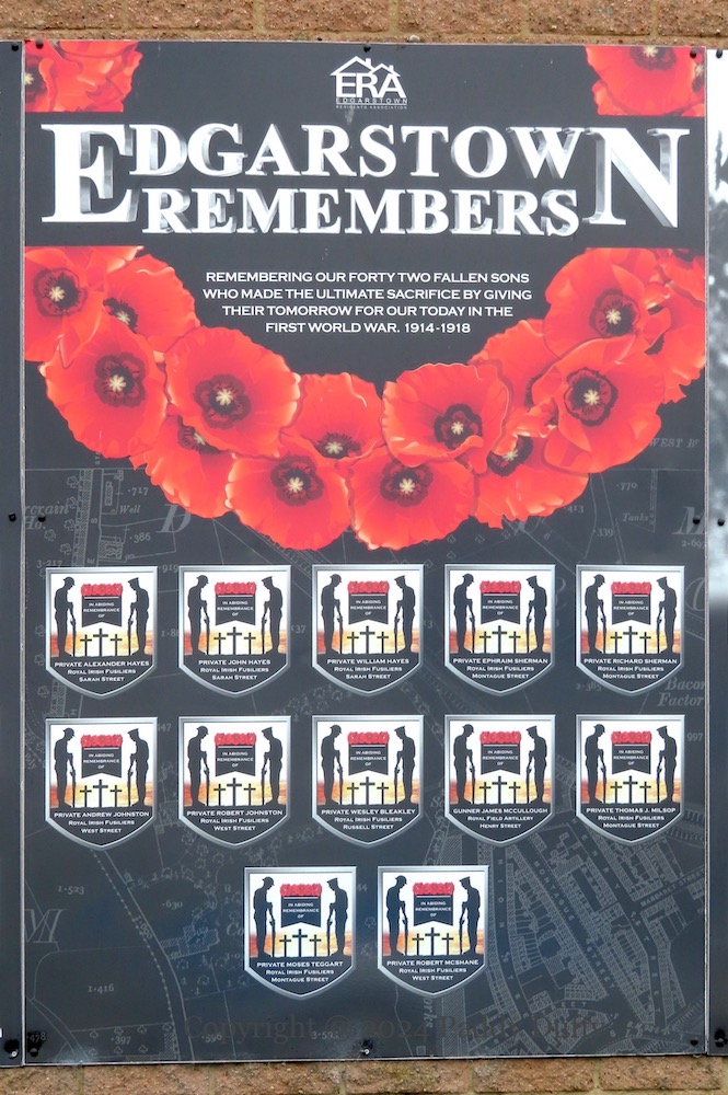 “In Deo speramus”. “Edgarstown Remembers” “our forty-two fallen sons who made the ultimate sacrifice by giving their tomorrow for our today in the Great War 1914-1918.” “Dear Lord, I am just a soldier, a protector of our land/A servant called to battle when my country takes a stand./I pray for strength and courage and a heart that will forgive/For peace and understanding in a world for all to live./My family’s prayers are with me, no matter where I roam./Please listen when I’m lonely and return me safely home – Unknown”