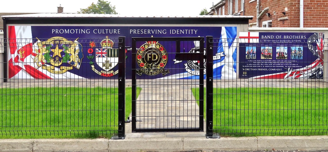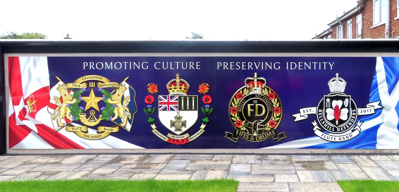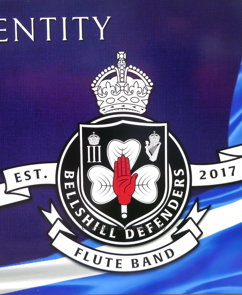 “Band Of Brothers. This artwork is a tribute to the unbreakable bond that we in North Belfast, share along with the following bands: Craigneuk [Scotland] True Defenders flute band, formed 1947 [Fb]; Andrew Murphy Memorial flute band [Scotland], formed 1988 [Fb]; City Of Belfast Fifes And Drums, formed 2003 [Fb]; Bellshill [Scotland] Defenders flute band, formed in 2017 [Fb]. For decades, these bands have remained faithful, and been a credit to the loyalist cause that binds us. When on parade, the honour and dignity displayed by each band, is impeccable. In timeless memory of the Fallen, each band proudly and respectfully bears the Colours and Emblems of: the Ulster Volunteer Force, the Young Citizen Volunteers, the 36th (Ulster) Division. ‘More than friends, comrades’.”