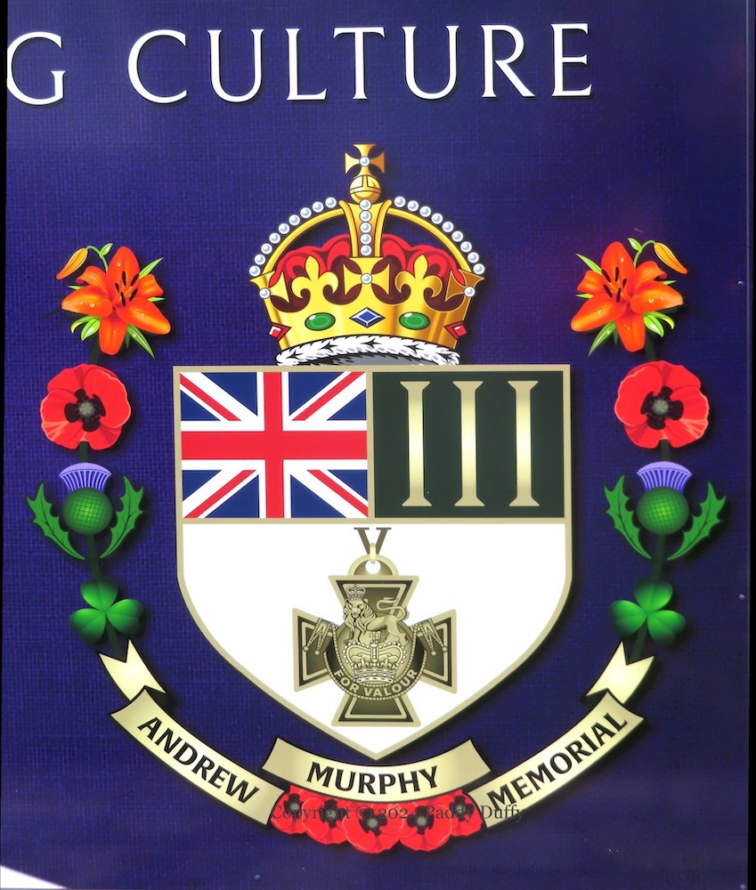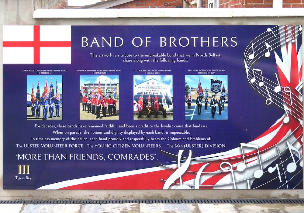 “Promoting Culture, Preserving Identity”. Here are a pair of new boards Mount Vernon Park, north Belfast, launched on August 11th, 2024, celebrating three Scottish bands and the local Fifes And Drums. Each of the bands’ emblems includes the Roman numeral “III”, which also appears in the bottom corner of the ‘Band Of Brothers’ board. It stands for the 3rd Belfast (i.e. north Belfast) battalion of the UVF, “Tiger’s Bay”. The St George’s Cross in the top-left corner and the purple background (of the ‘Band Of Brothers’ board) come from the UVF flag, which typically also has an orange star in the bottom right, here replaced by a swirling musical staff and Union Flag.