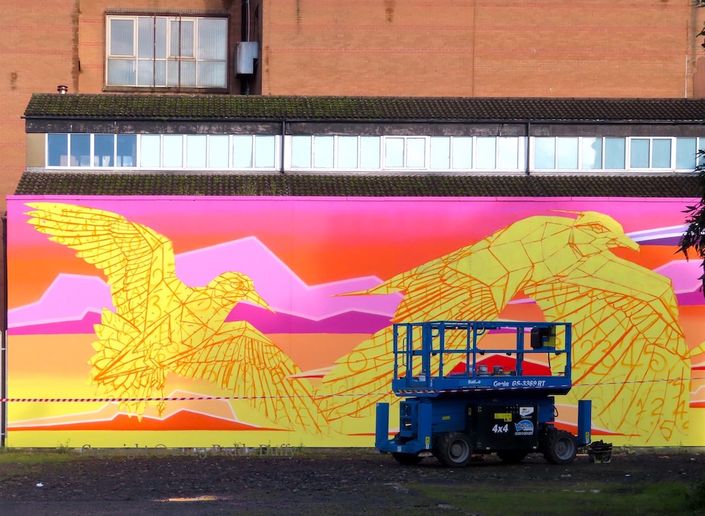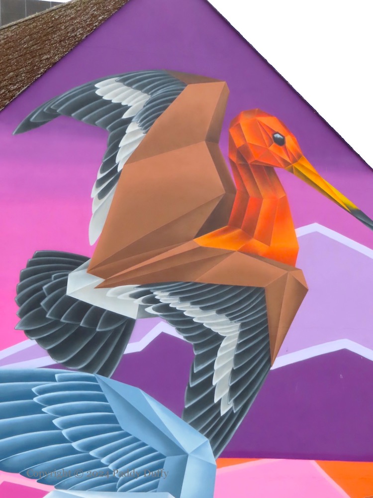 Here are four species of bird flying in convoy through Belfast city centre. From left to right we see dunlin, lapwing, godwit (above), and Arctic tern (below). The art was painted by Annatomix (web), with support from Daisy Chain (web), as part of the “Great Expectations” project from the Linen Quarter Business Improvement District (web).