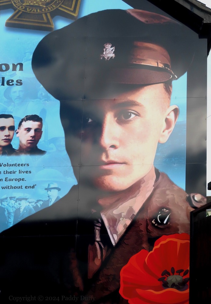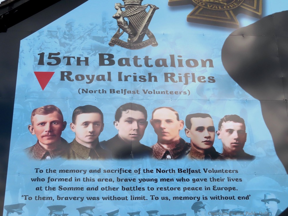 “15th battalion Royal Irish Rifles (North Belfast Volunteers). To the memory and sacrifice of the North Belfast Volunteers who formed in this area, brave young men who gave their lives at the Somme and other battles to restore peace in Europe. ‘To them, bravery was without limit. To us, memory is without end.'” Five of the six portraits were included in the previous mural (see Many Did Not Return): (1) Rifleman Forrester, (2) Rifleman Baird, (4) Sergeant Major Magookin, (5) Rifleman Templeton, (6) 2nd Lt De La Harpur.