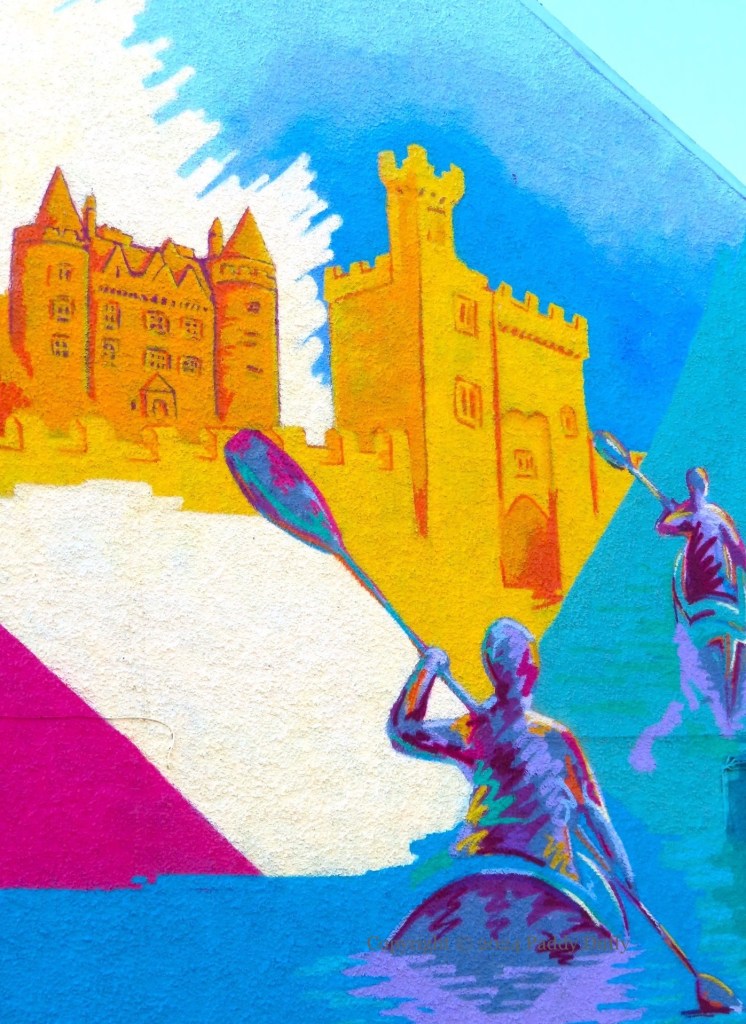 The distinctive turrets of Killyleagh Castle were added by Charles Lanyon in the mid 1800s, when the house – parts of which go back to the 1100s – was renovated (Castles World). There is no water around the grounds but Canoe NI has maps of trails in the Strangford Lough area that go past Killyleagh.