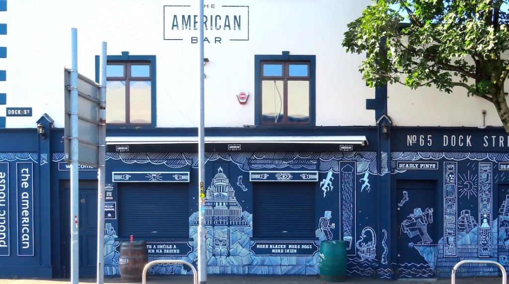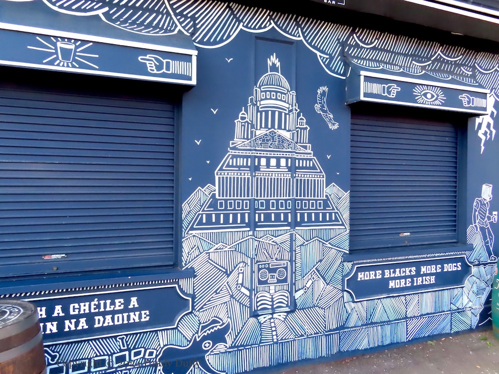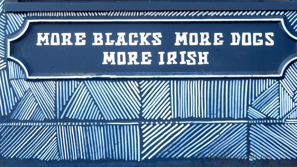 Below the windows are “Ar scáth a chéıle a mhaıreann na daoıne” and “More Blacks, more dogs, more Irish.”