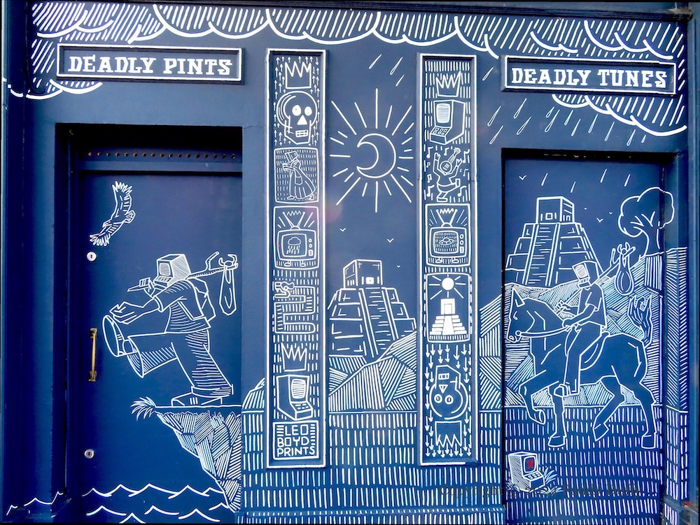 “Deadly” here means “excellent” or “terrific”, perhaps from the idea of “hitting the (living!) target” (Stack) – it is a piece of southern slang that artist and print-maker Leo Boyd (web) perhaps picked up on his journey from Bristol to Dublin to Belfast (Boyd | Atom) where he is one of the Vault Studios artists (Vault).