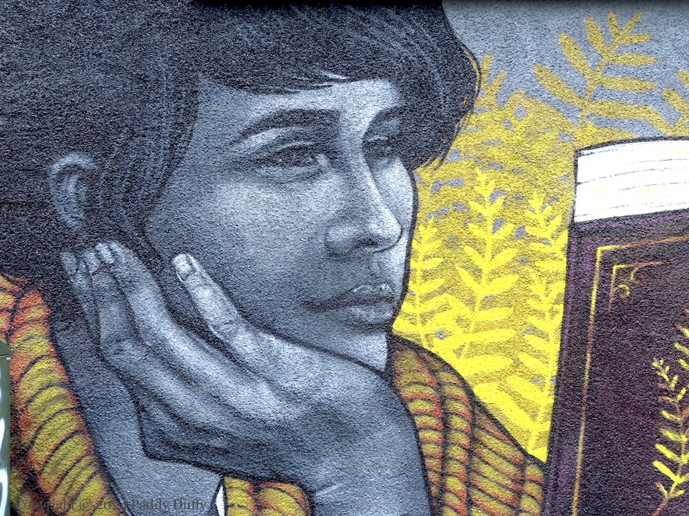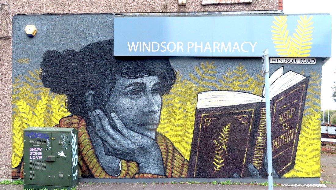 This painting of a person finding help in a book about how to find help within is by Friz (web) on the side of the Windsor Pharmacy, at the junction of Lisburn Road and Windsor Road, south Belfast.