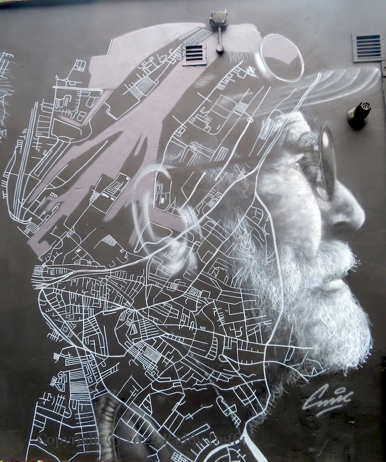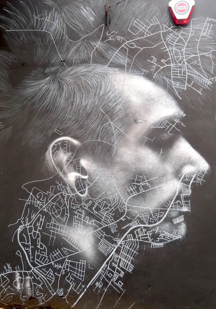 Youth follows age and west (Belfast) looks towards east in these black-and-white combinations of portraits and maps by emic (web) on the side of Belfast Woodfired Pizza in Lislea Drive, south Belfast (which does not appear in the maps).