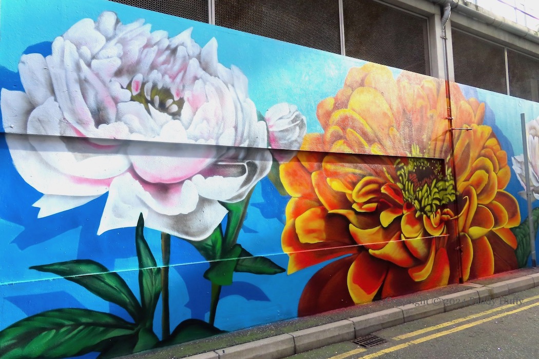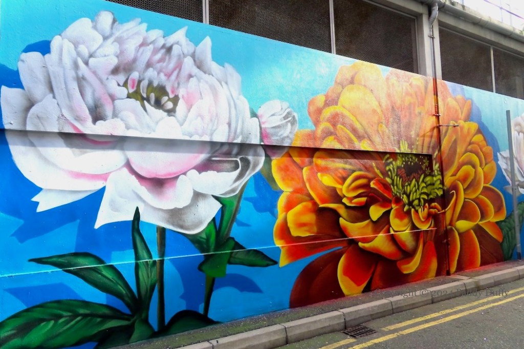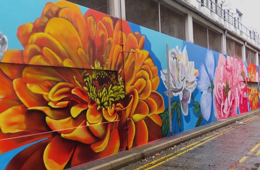 A long garage wall (40+ metres) in Franklin Street Place (between Franklin St and James St South) has been brightened up by Visual Waste (web) with a variety of painted flowers.