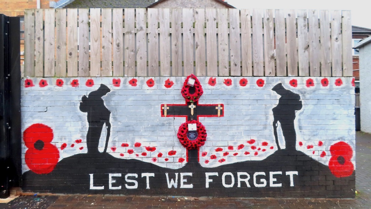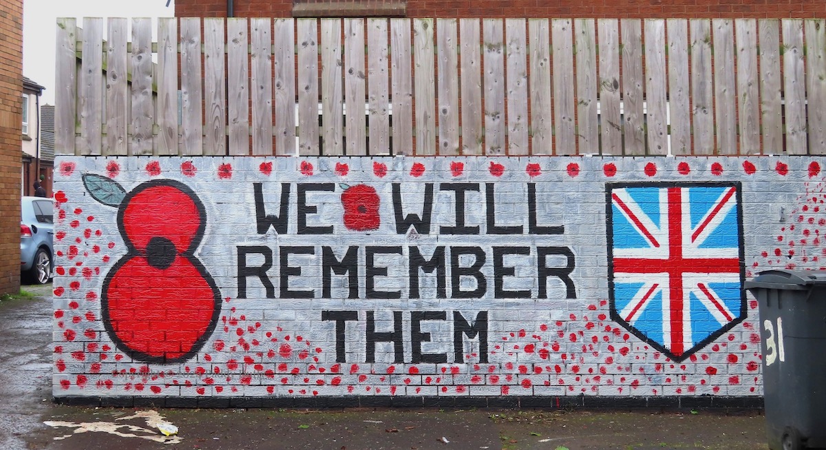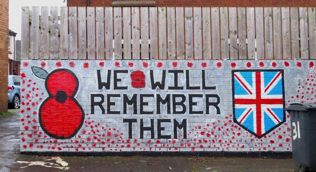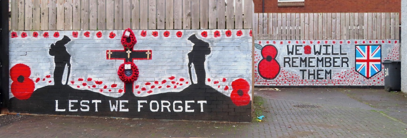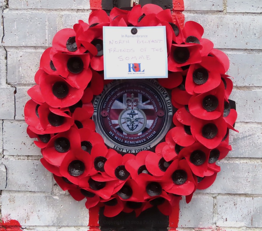 The rosette at the centre of the poppy wreath shows the UK armed services badge (with the crown overlaid by the Ulster Banner) surrounded by a verse from Binyon’s ‘For The Fallen’ and “Tiger’s Bay – York Street – Sailortown loyal”. That group’s Facebook page is private and no home-page seems to be available for ‘North Belfast Friends Of The Somme’.