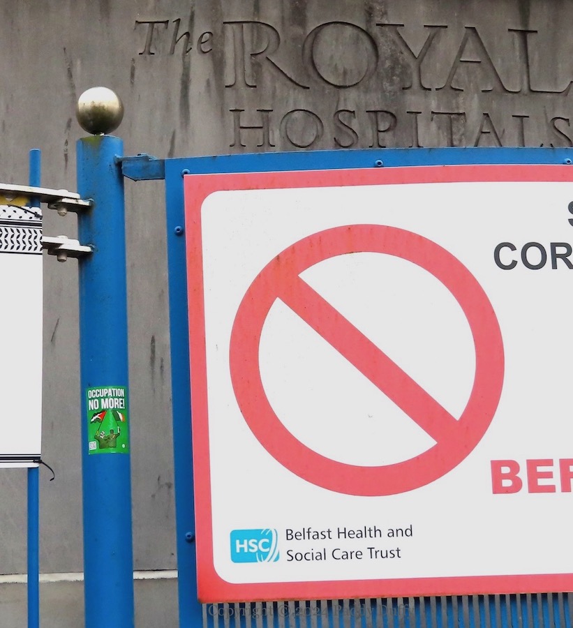 The placard was mounted by BDS Belfast in March (Fb). The “Occupation no more” sticker on the adjacent pole is from the 1916 Societies (web).