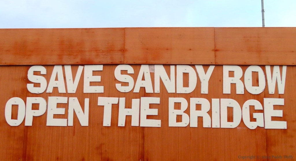 “Save Sandy Row – open the bridge”. “Sensitive dismantling” of the Boyne Bridge began at the end of November (BBC), as part of the restructuring around the new Grand Central Station despite another protest from locals who allege that the bridge is an essential part of Sandy Row culture (see the entry Battle Of The Boyne Bridge in the Paddy Duffy Collection). (There was an earlier protest on November 5th (BBC); the images below confirm the Irish News‘s estimate of “several dozen”.)