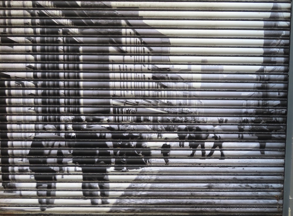 These shutters of a solicitor’s office in Mill Street, Ballymena, are painted with a view of the street from around the turn of the (20th) century.