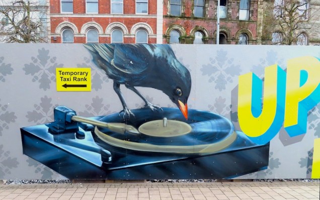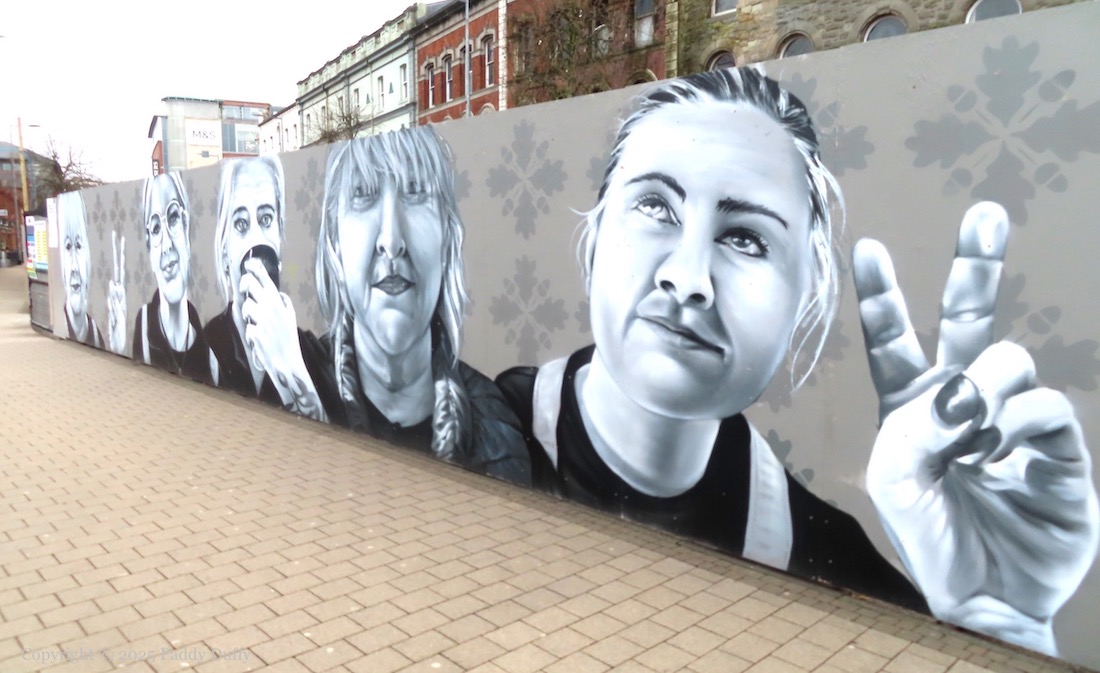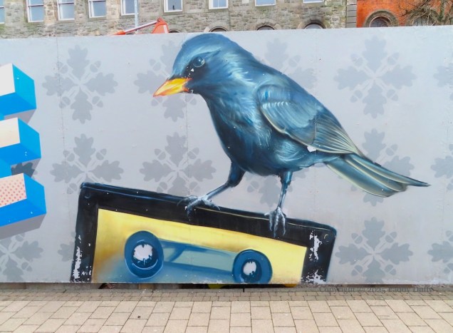 We also see two musical crows – one is playing DJ and the other is carrying a cassette tape – and five humans, who also didn’t come up the Foyle in a bubble – “I didn’t come up (or “float up”) the Foyle in a bubble” means “I’m no fool” or “I wasn’t born yesterday”.