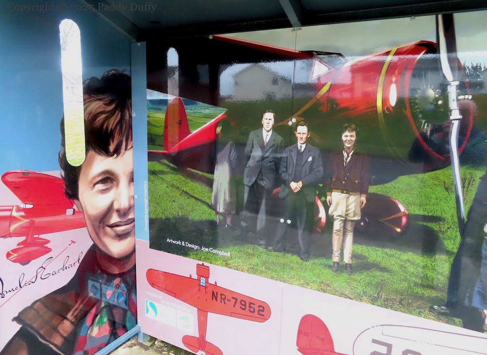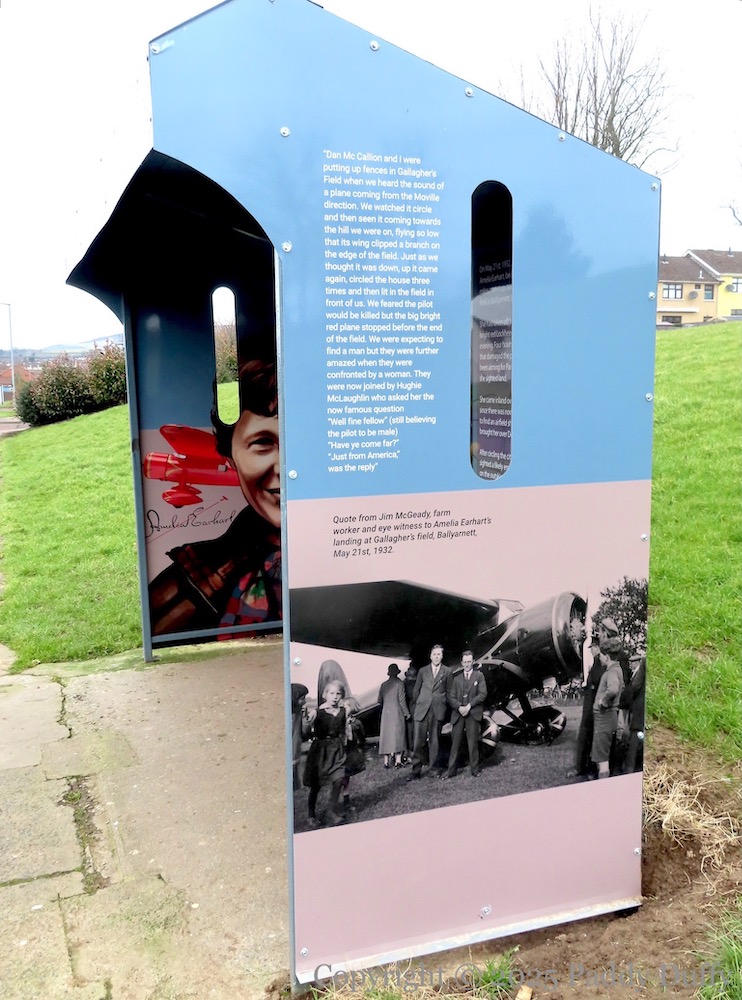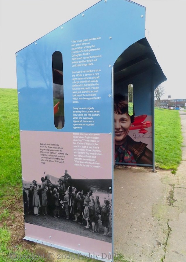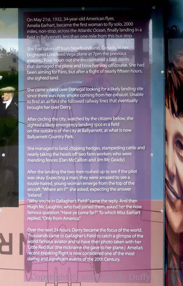 The internal verbiage reads: “On May 21st, 1932, 34-year-old American flyer, Amelia Earhart, became the first woman to fly solo, 2000 miles, non-stop, across the Atlantic Ocean, finally landing in a field in Ballyarnett, less than one mile from this bus stop. She had taken off from Newfoundland, Canada, in her bright red Lockheed Vega plane [NR-7952] at 7 pm the previous evening. Four hours out she encountered a bad storm that damaged the place and blew her way off course. She had been aiming for Paris, but after a flight of nearly fifteen hors, she sighted land. She came inland over Donegal looking for a likely landing site since there was now smoke coming from her exhaust. Unable to find an airfield she followed railway lines that eventually brought her over Derry. After circling the city, watched by the citizens below, she sighted a likely emergency landing spot in a field on the outskirts of the city of Ballyarnett, at what is now Ballyarnett Country Park. She managed to land, clipping hedges, stampeding cattle and nearly taking the heads off two farm workers who were mending fences (Dan McCallion and Jim McGeady). After the landing the two men rushed to see if the pilot was okay. Expecting a man, they were amazed to see a tousle-haired, young woman emerge from the top of the aircraft. “Where am I?” she asked, expecting the answer ‘Ireland’. “Why, you’re in Gallagher’s Field!” came the reply. [Here is an audio recording (youtube) of Mrs Gallagher recounting Earhart’s arrival and stay.] And then Hugh McLaughlin, who had joined them, asked the now famous question, “Have ye come far?” To which Miss Earhart replied, “Only from America.” Over the next 24 hours, Derry became the focus of the world. Thousands came to Gallagher’s Field to catch a glimpse of the world famous aviator and to have their photo taken with her ‘Little Red Bus’ (the nickname she gave to her plane.) Amelia’s record-breaking flight is now considered one of the most daring and significant events of the 20th Century.”