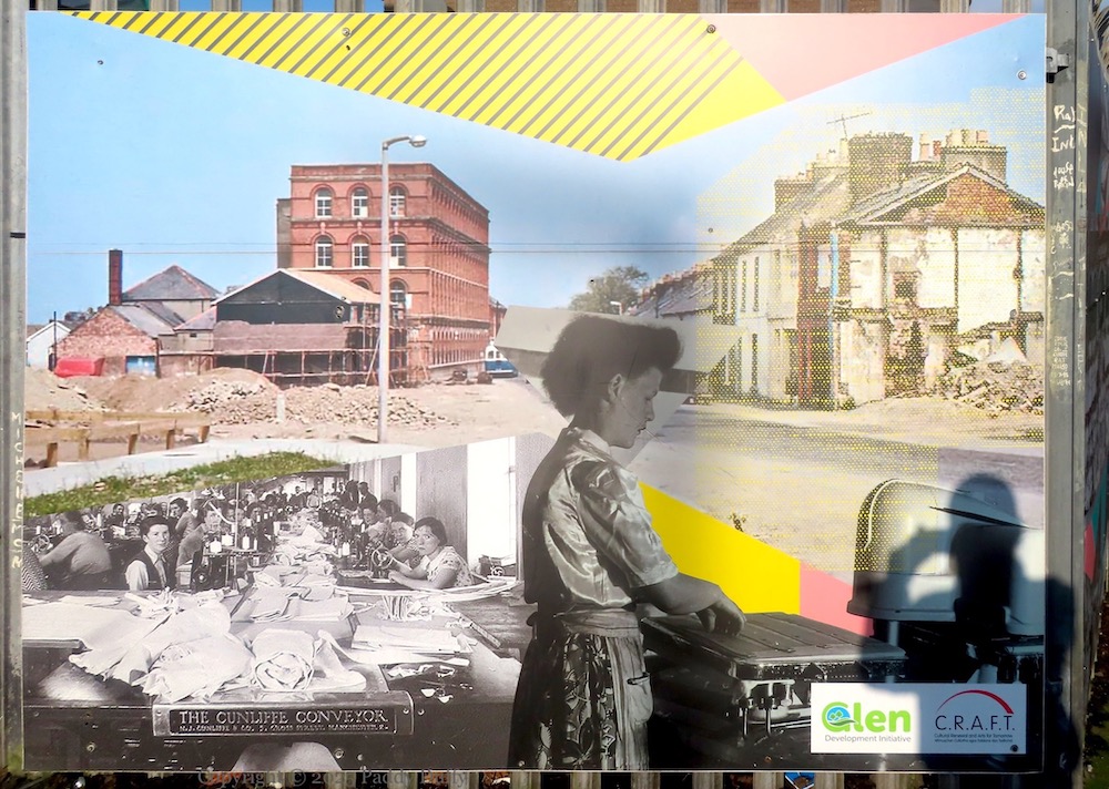 In the 1920s, there were 44 shirt-making factories in Derry employing almost 20% of the city’s population (IAR). (Derry Of The Past has a Fb gallery of historical images of factories.) One of those factories was – and the building still stands – in the Rosemount area, a stone’s throw away from this 2021 artwork by Peaball (web), alongside boards with vintage photographs. Supported by iPrint (ig), Glen Development Initiative (Fb), and CRAFT (Cultural Renewal [and] Arts For Tomorrow).