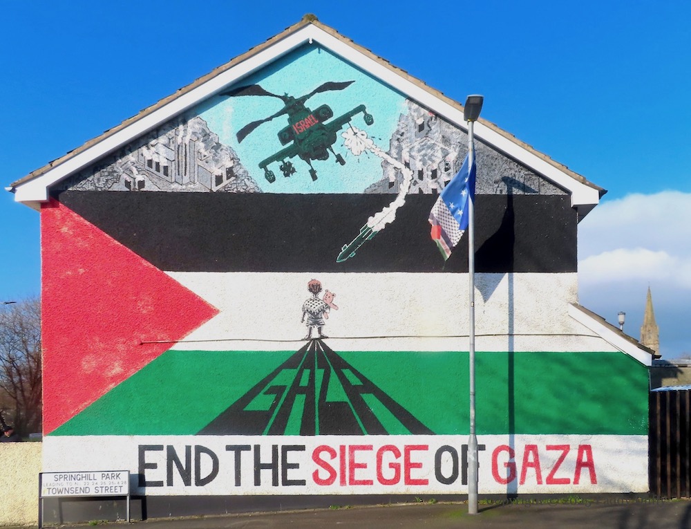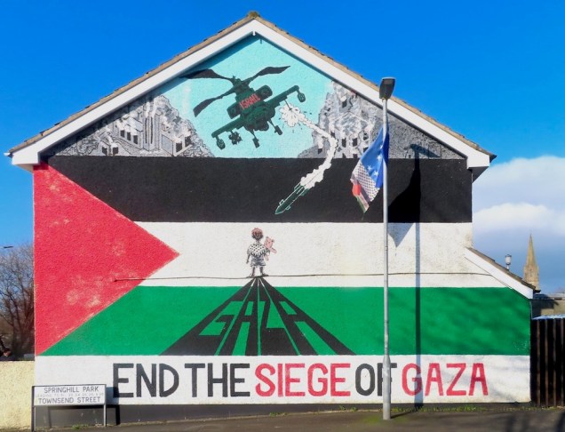 This is a 2014 mural in Strabane that is still is decent shape and still/again relevant, as there are now more than 62,000 deaths in Gaza (Al Jazeera) and aid into the territory has once again been blocked and electricity cut off by Israel (AP | Standard). The mural reproduces a Carlos Latuff (ig) image of an Israeli Apache helicopter firing a “hellfire” missile at a Palestinian child. It was painted by John Carlin and friends (Highland Radio). (It was also reproduced in Springhill, west Belfast, by Mo Chara Kelly.)