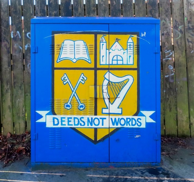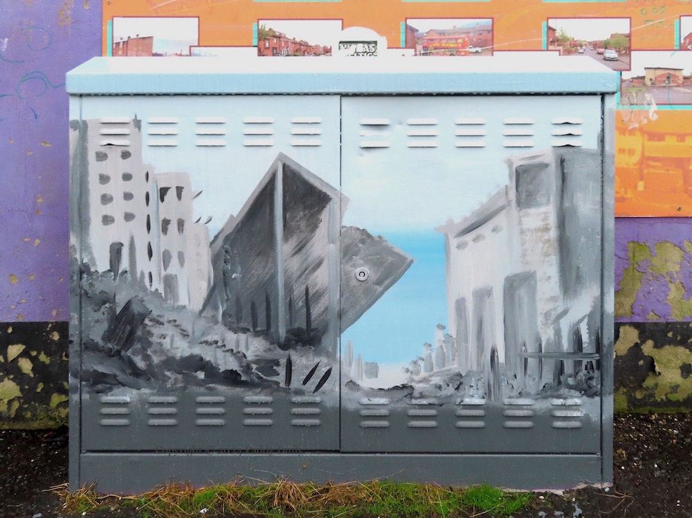 The five shown here are in North Howard Link, Glen Road, Glen Road, Edenmore Drive, and Springhill Drive and the latter three reflect the ‘community’ theme that the boxes have had in CNR west Belfast – “deeds not words” is the motto of St Teresa’s primary, the second is from De La Salle secondary, and the last is of falling-down buildings (perhaps) inspired by the bombing of Gaza.