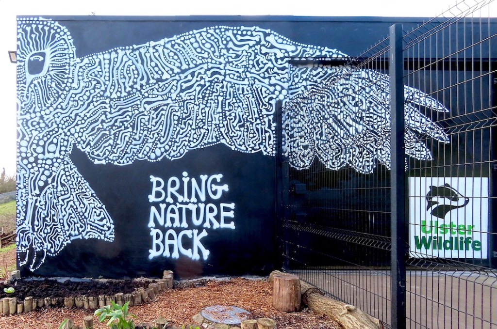 This giant barn owl at the top (Falls-Road side) of the Bog Meadows is one of several pieces being painted by Craig in various UK locations to highlight local species that are endangered. The other piece, so far, is of a red squirrel in Cornwall. In the case of Belfast and Northern Ireland, only 30 pairs of barn owls remain, at most (Ulster Wildlife).