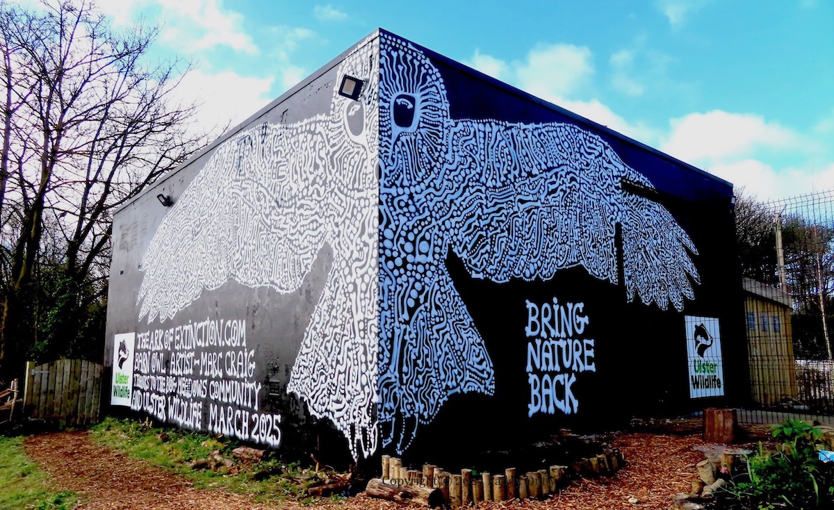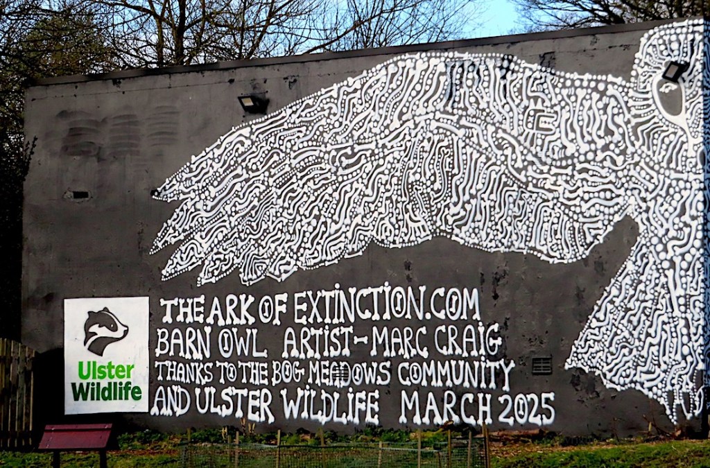 “The Ark Of Extinction.com – Barn Owl – artist Marc Craig – Thanks to the Bog Meadows Community [Fb] and Ulster Wildlife [web], March 2025 – Bring nature back”.