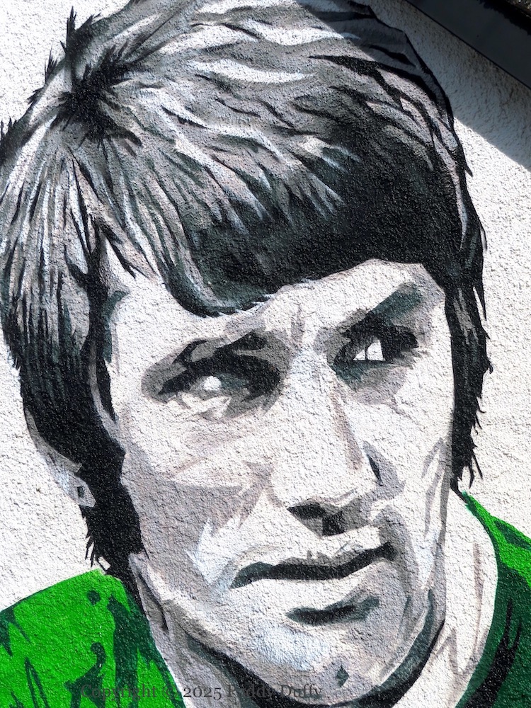 This mural depicts a very young Best, perhaps circa 1967; the source image is unknown – Best typically parted his hair from the left and exposed his teeth. The piece was painted by ACE Sprayworks (web), with support from Warren Anderson Tiling, at Anderson’s home near Cloughmills. (Sunday World)
