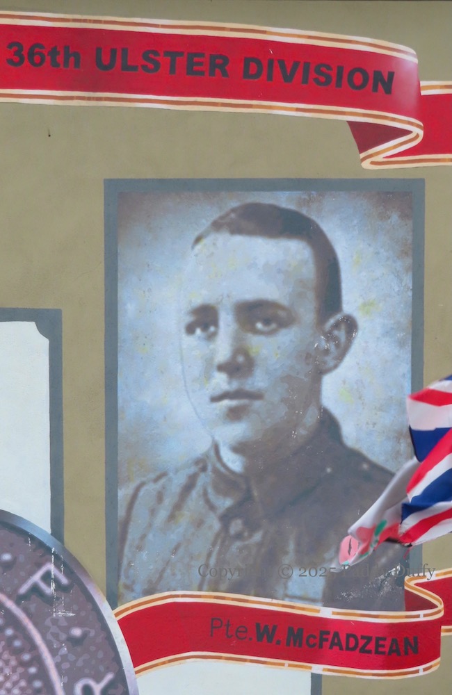 For his heroism, Billy McFadzean (14th RIR) was awarded the VC (WP). The other VC winners pictured alongside McFadzean in the Cappagh Gardens mural (above and immediately below) are G[eoffrey St. George Shillington] CatherR[obert] Quigg, and E[ric] N[orman] F[rankland] Bell.