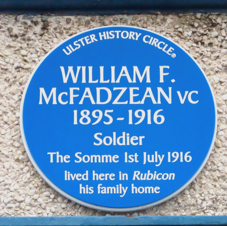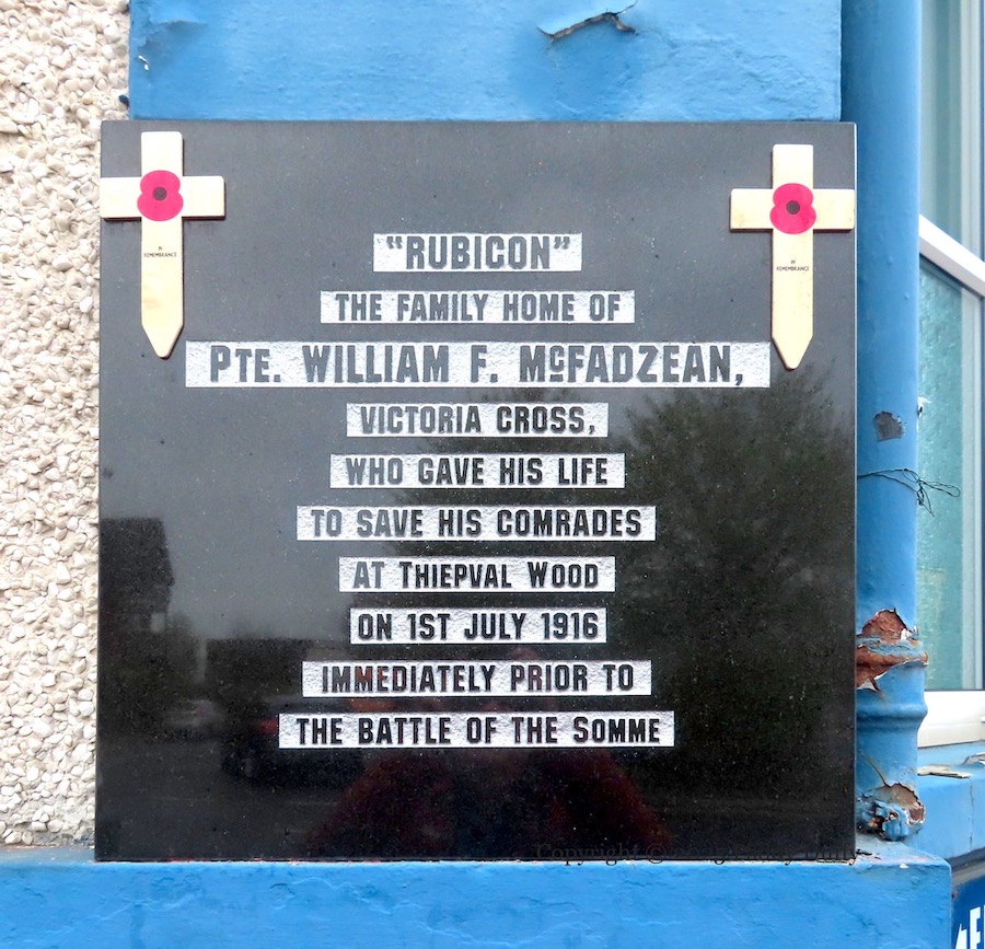 “‘Rubicon’ – the family home of Pte. William F. McFadzean, Victoria Cross, who gave his life to save his comrades at Thiepval Wood on 1st July 1916 immediately prior to the Battle Of The Somme.” – McFadzean died when he threw himself on a fallen box of grenades.