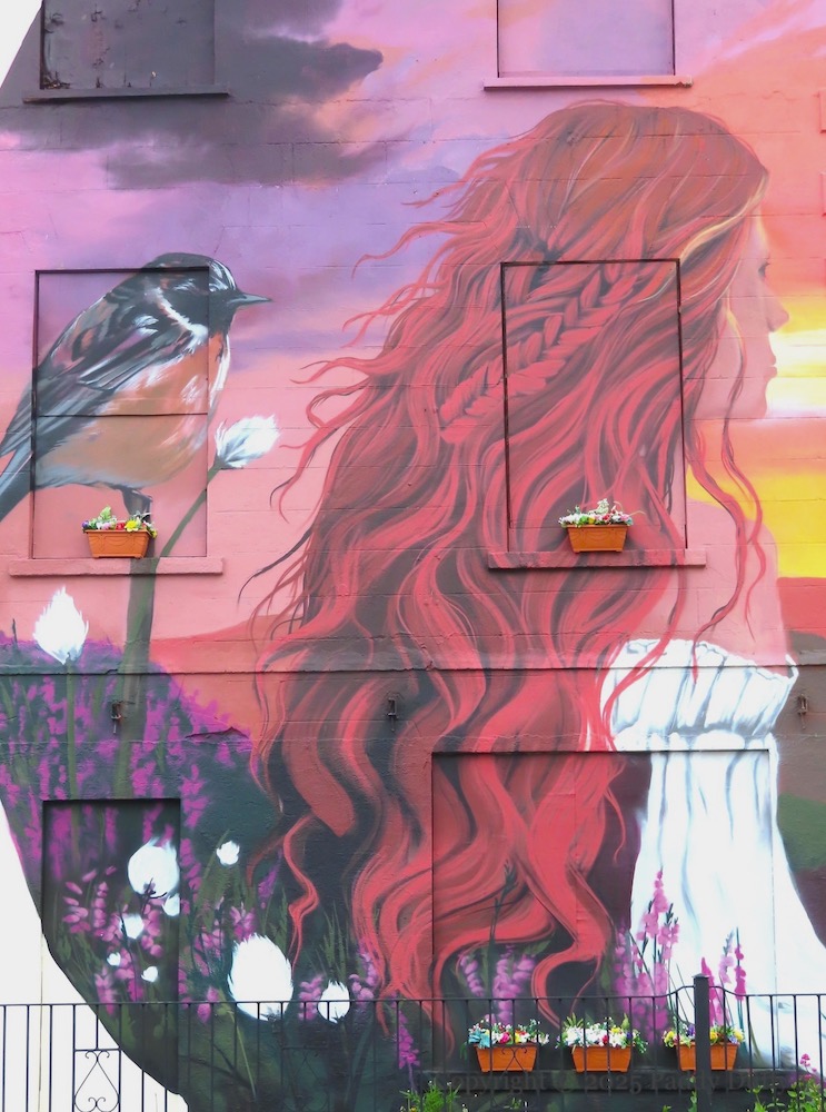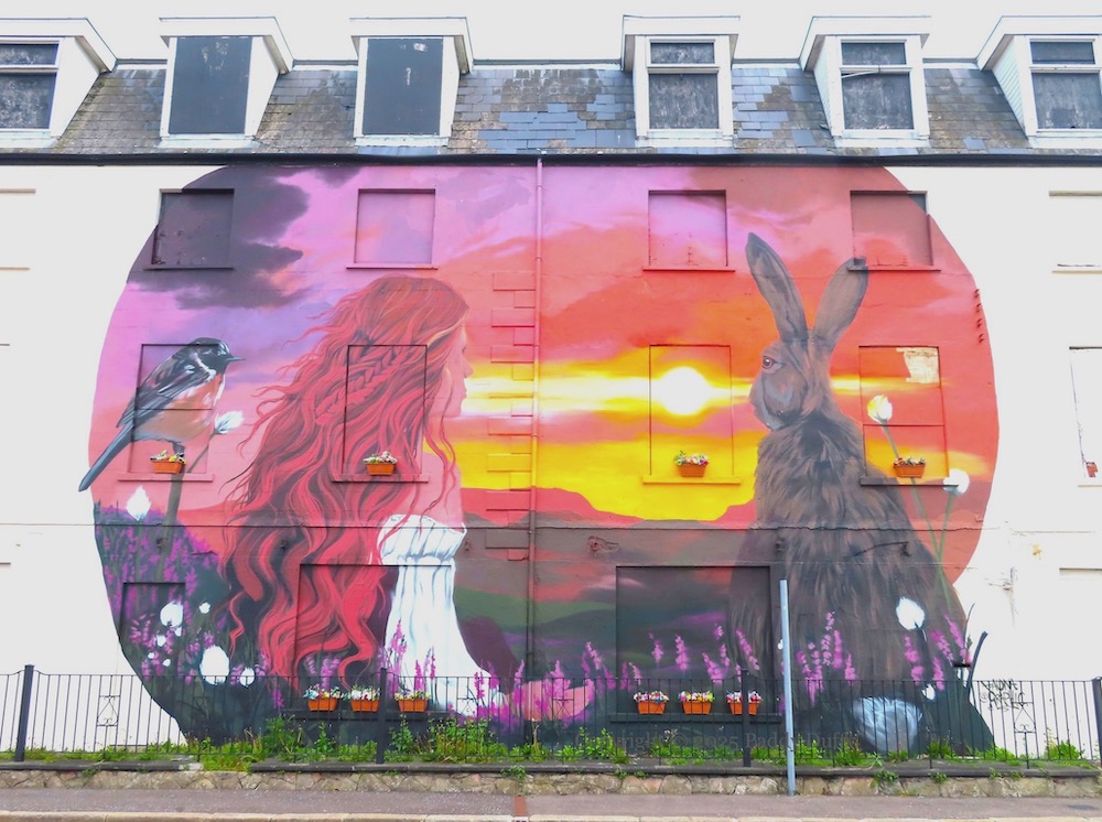 This street art was painted for last year’s (2024) festival on the boarded-up façade of the Osborne Hotel by English artist Faunagraphics (web).