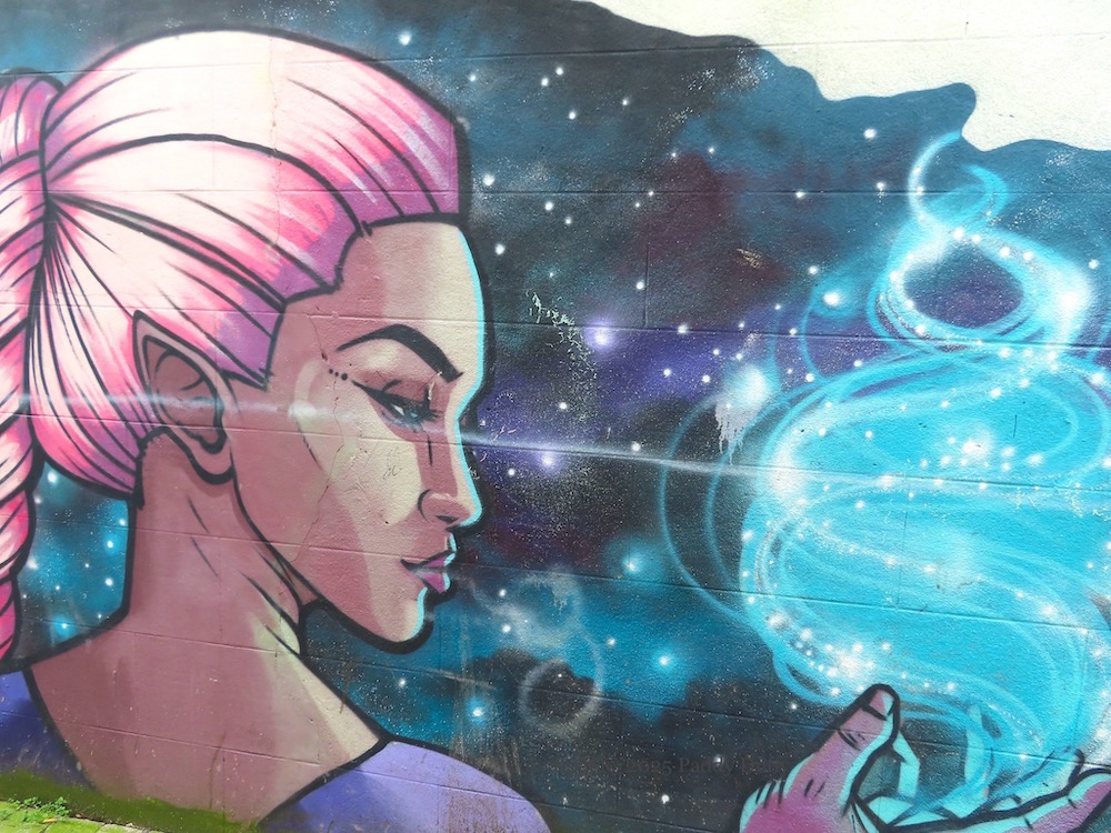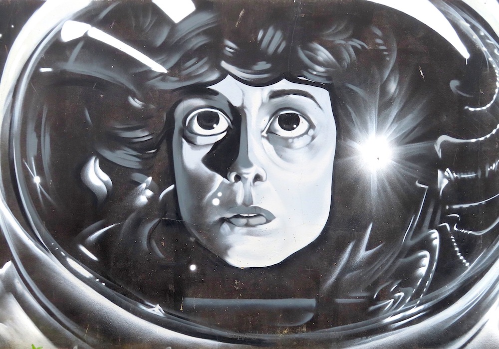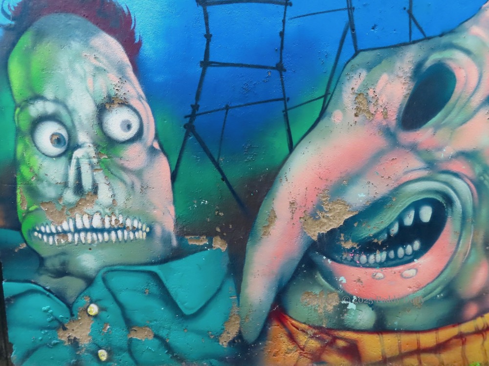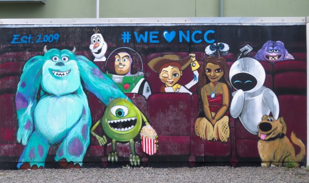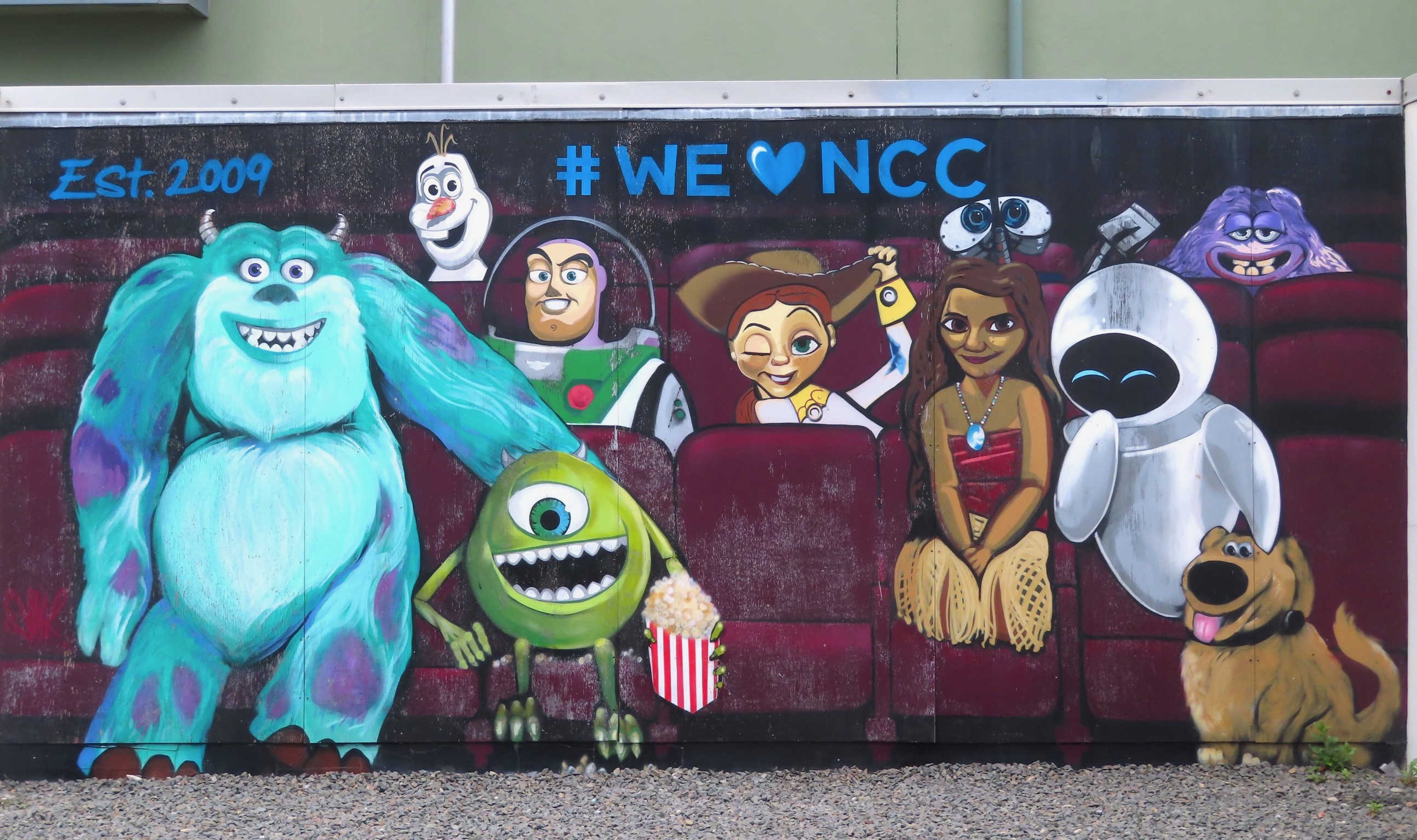 “NCC” in the final image, below (of movie characters at the cinema), stands for Newcastle Community Cinema (web) which opened on Halloween night, 2009. The street art shown here is at the organisation’s current hall, in Main Street, home not just to movie nights but activities including martial arts and u3a. The pieces are by Friz (web), KVLR (web), and JMK.