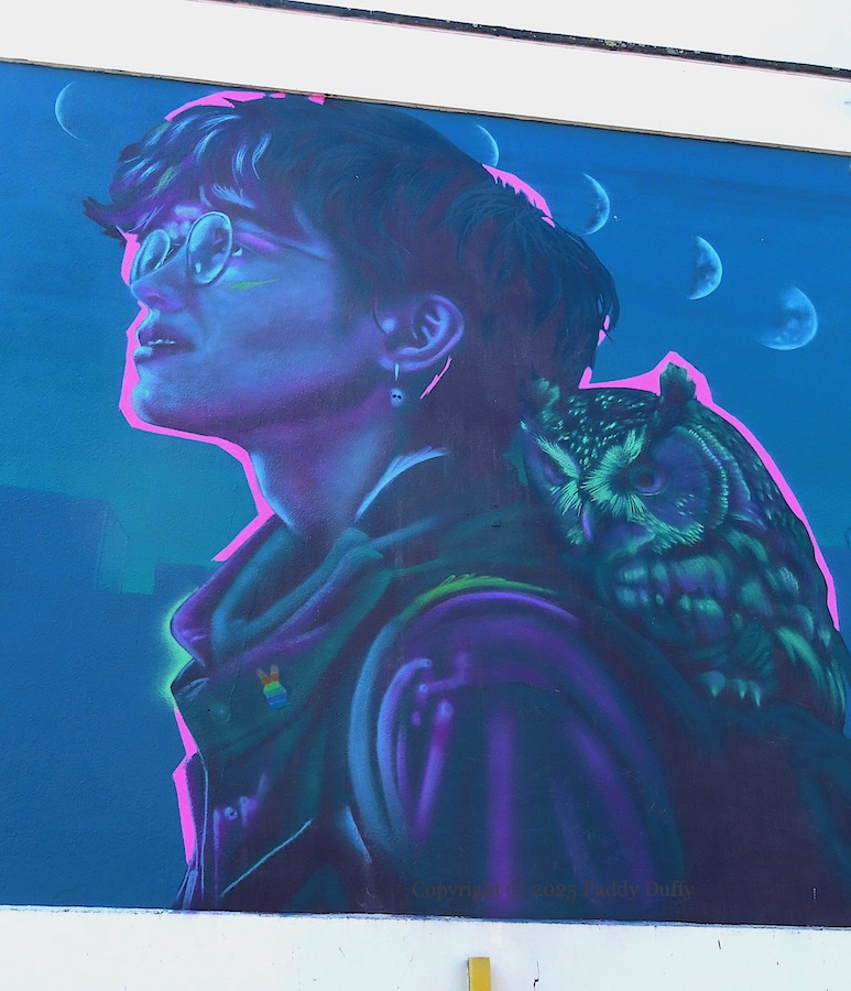 A student makes their way through the cycles of the moon, with Pride pin, skull earring, and owl familiar (and horcrux scar on the cheek?) to guide the way.