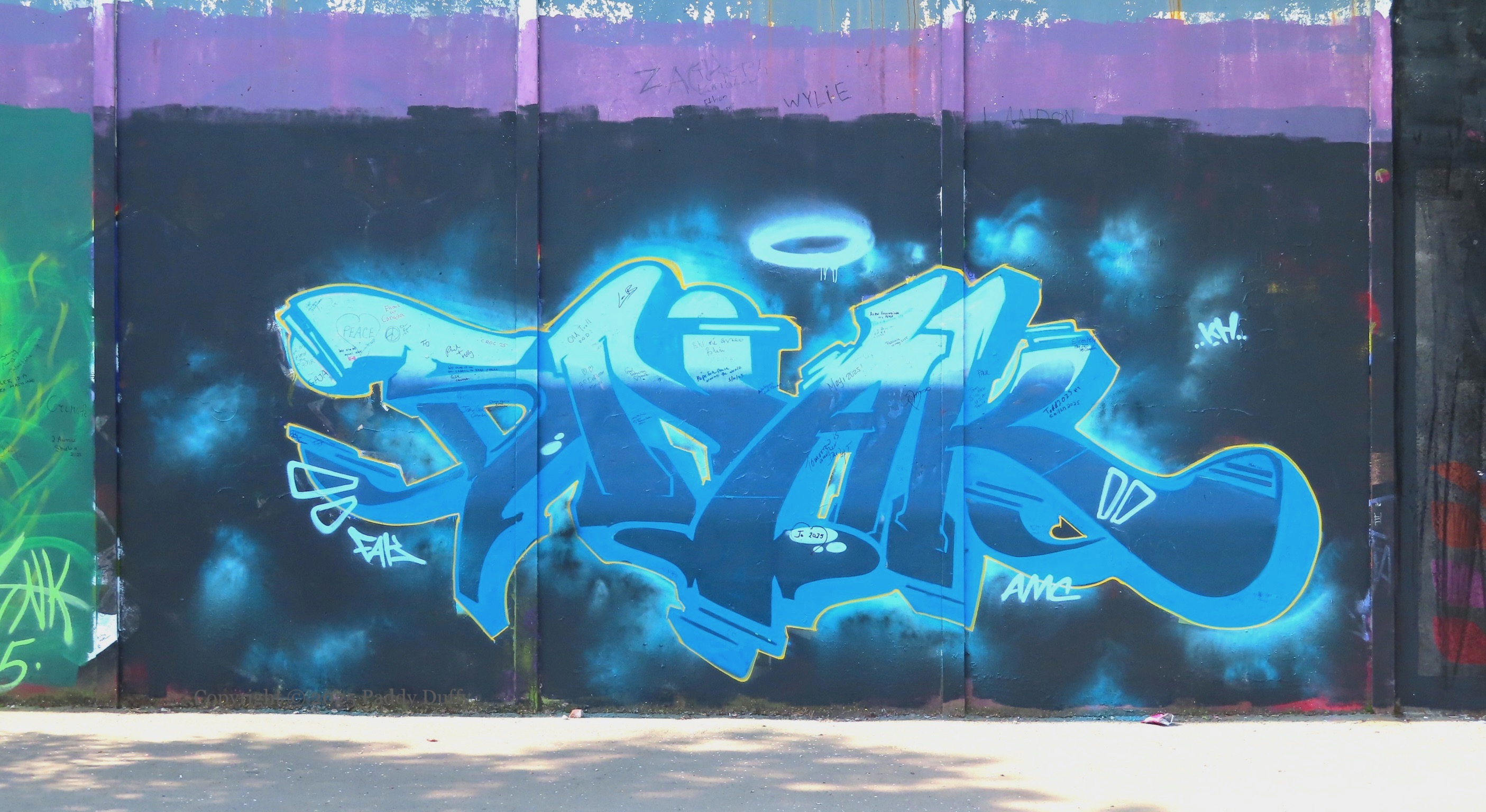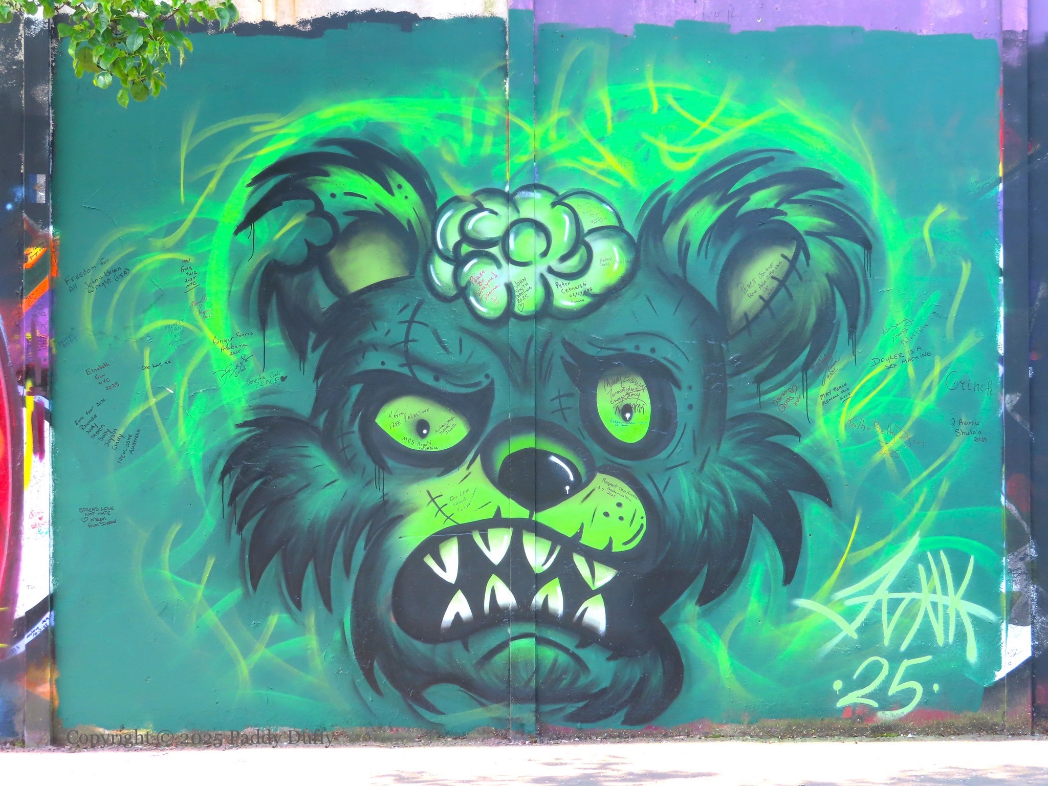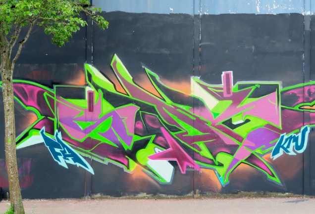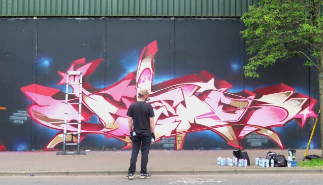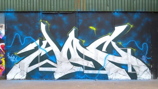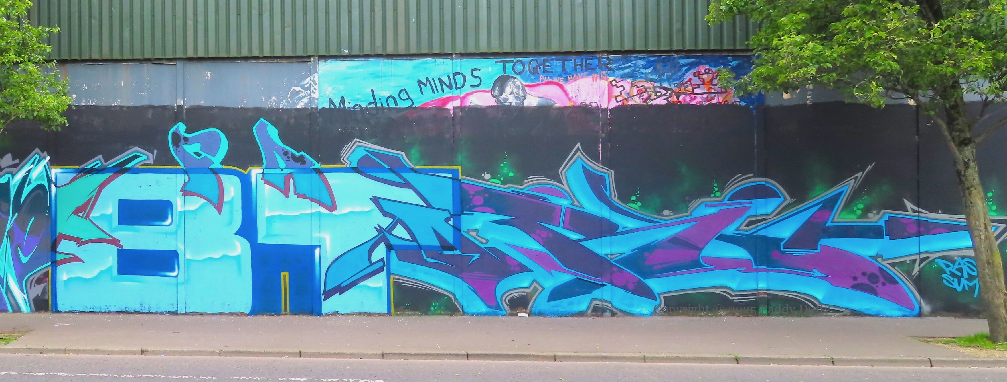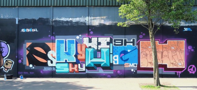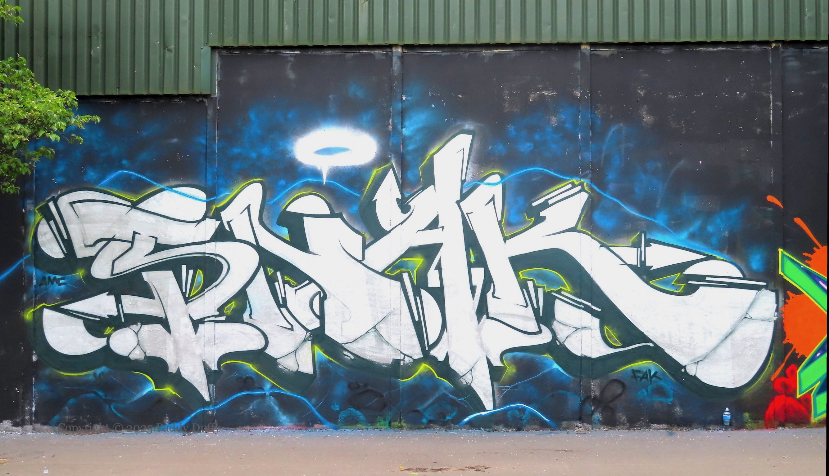 Here is a selection of art from the Cupar Way section of the west Belfast “peace” line. Some of the artists were visitors who were in town for Hit The North 2025 (Roo, Philth, Sky High – all of which were immediately blacked out). We also see work by Ohhi Ohno, SNAK, NOTA, KAYOS, Junk Graff, and others.
