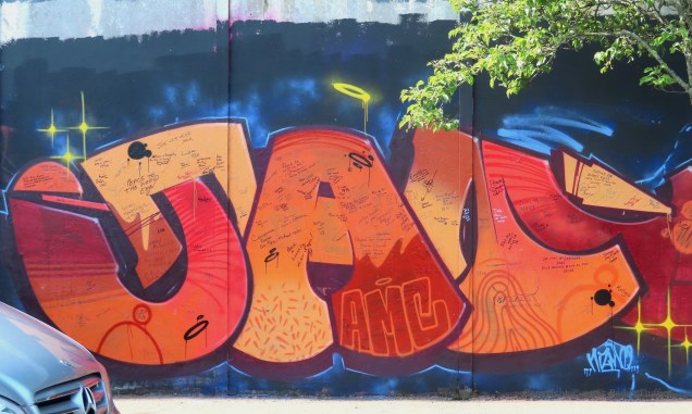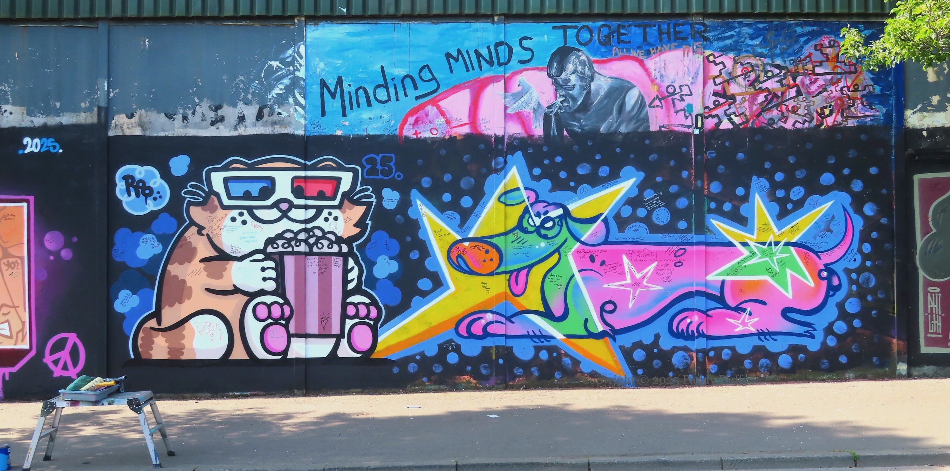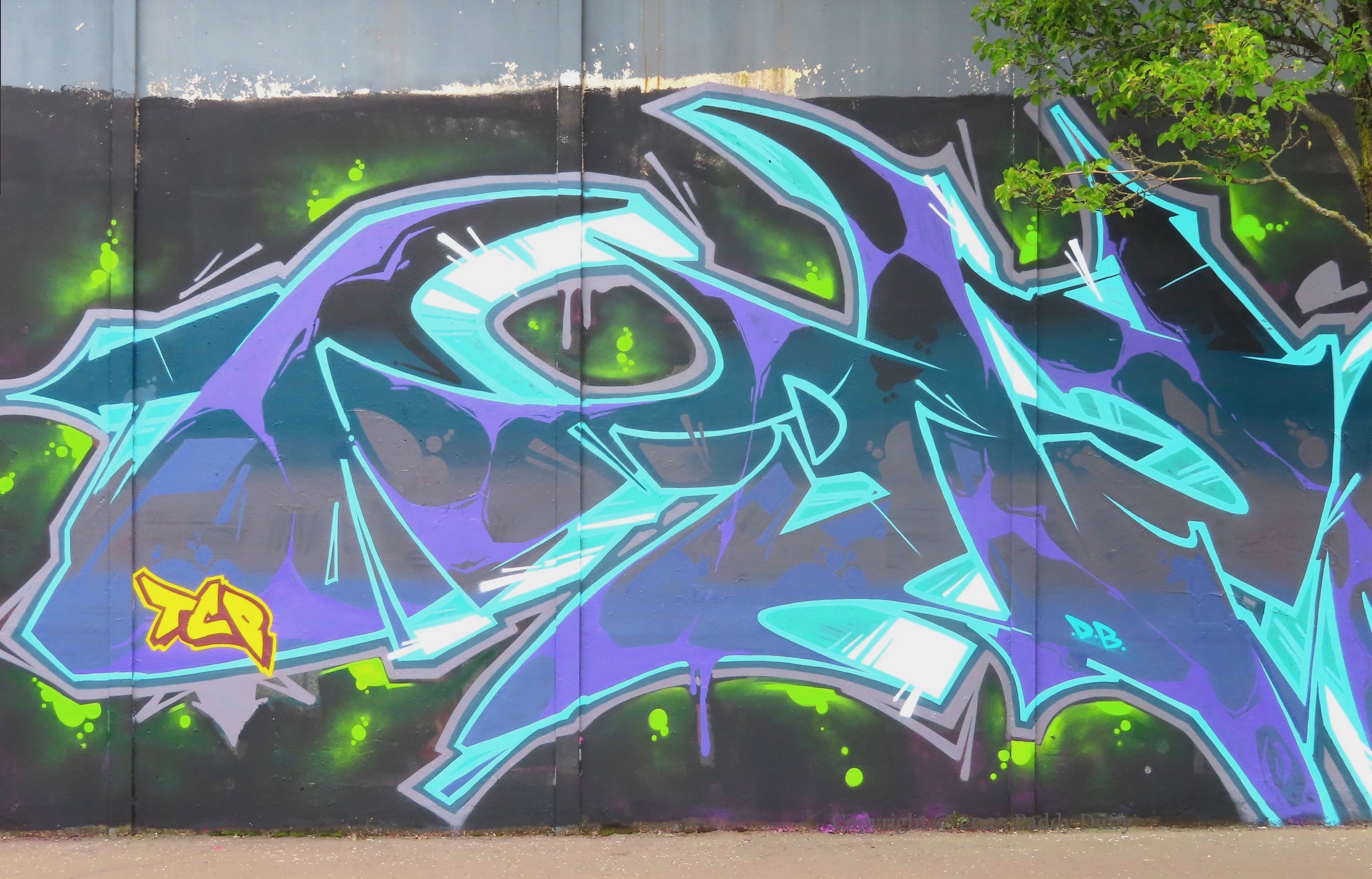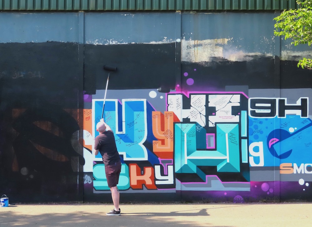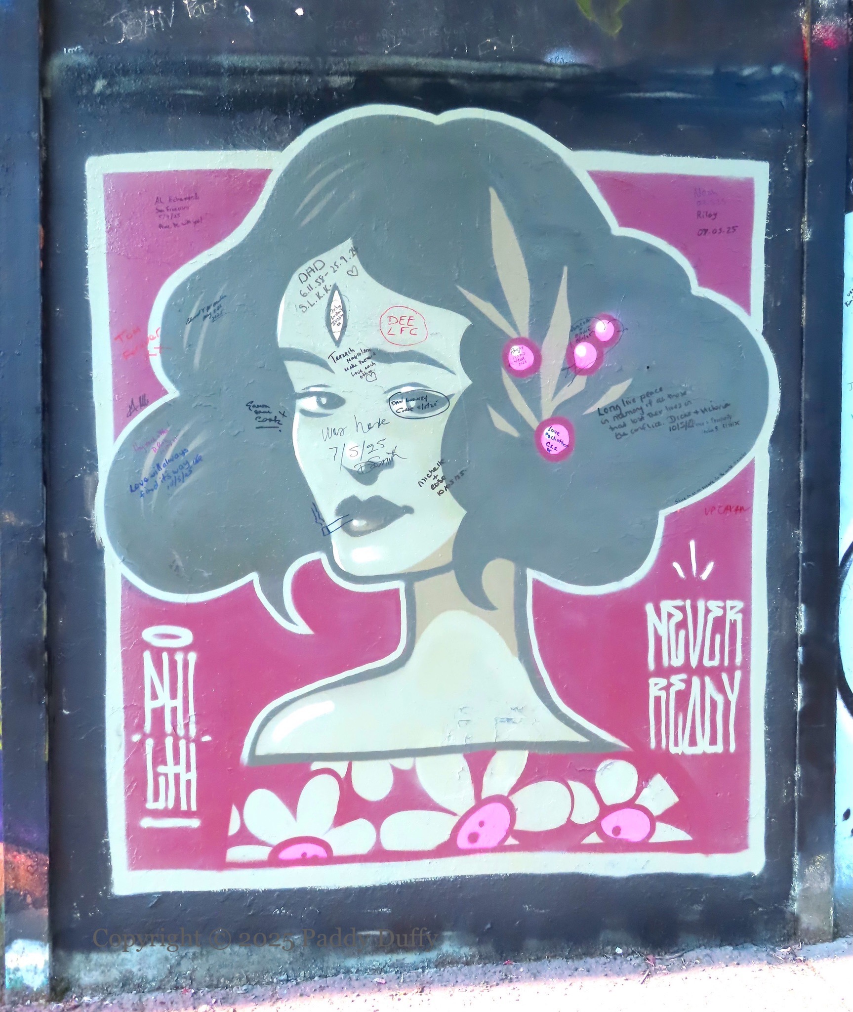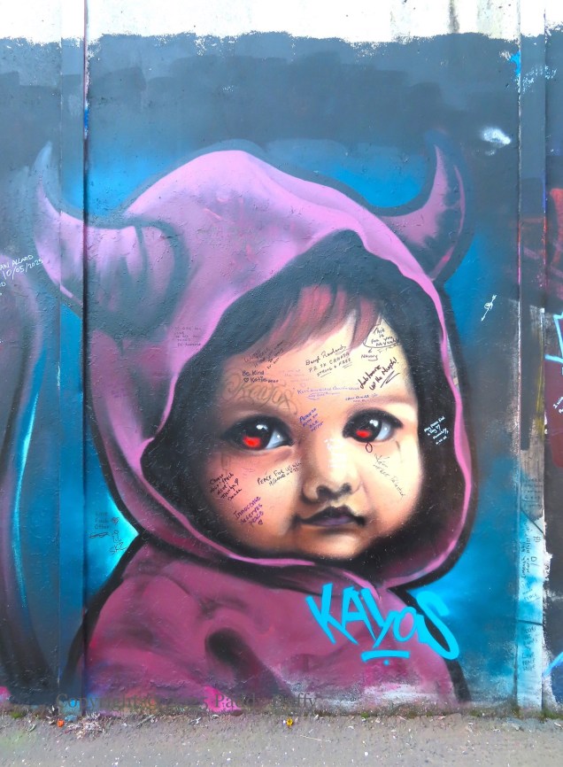 Here is a selection of art from the Cupar Way section of the west Belfast “peace” line. Some of the artists were visitors who were in town for Hit The North 2025 (Roo, Philth, Sky High – all of which were immediately blacked out). We also see work by Ohhi Ohno, SNAK, NOTA, KAYOS, Junk Graff, and others.