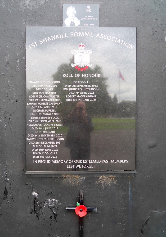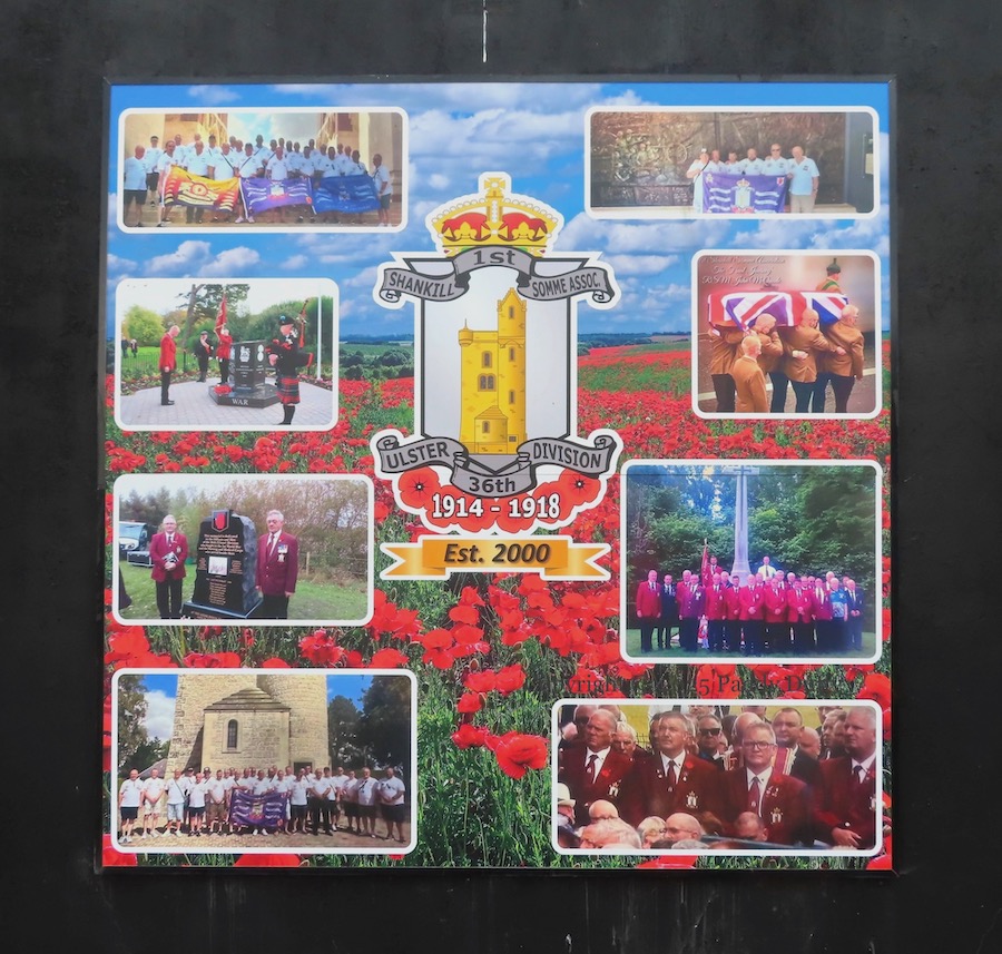 “1st Shankill Somme Association [Fb] roll of honour. In memory of our esteemed past members. Lest we forget.” The Association celebrated its twenty-fifth anniversary in February of this year (2025) and celebrated with a march from the leisure centre up to the garden of reflection next to the Shankill graveyard (Fb). The new retrospective board above shows members of the Association at trips to various WWI landmarks across the years.
