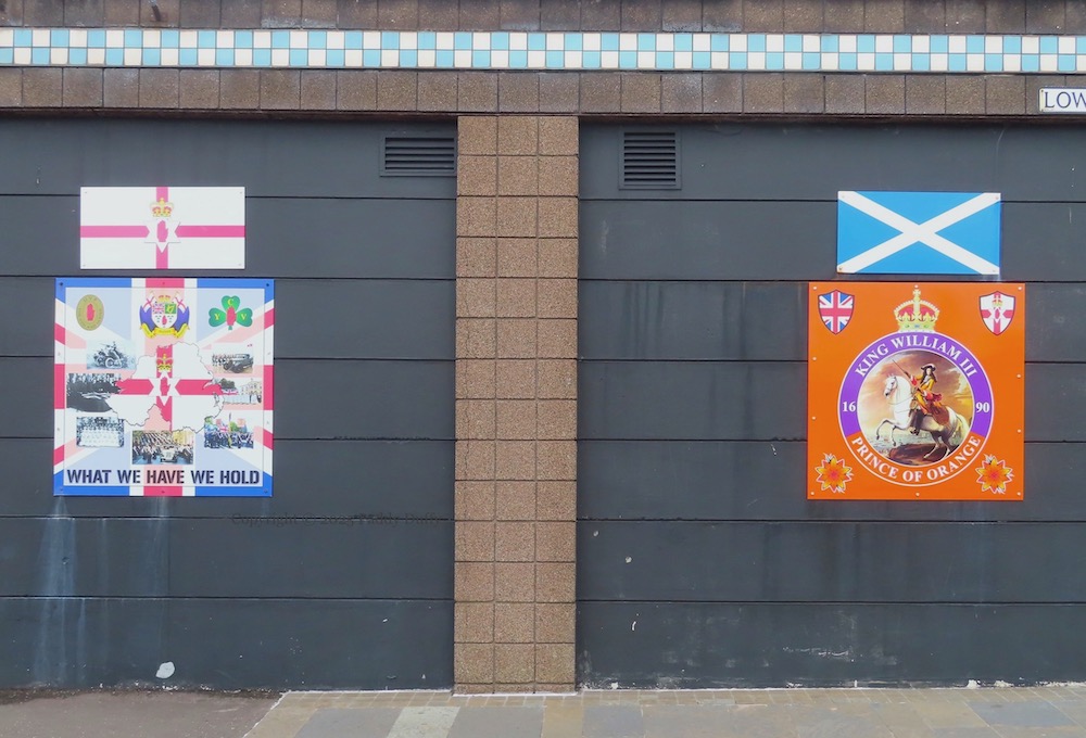 “Loyalist Village, south Belfast.” UVF markings in the Village continue to proliferate with the recently-added board shown above (from the top of Tavanagh Street) alongside a slew of other boards, some of which are included below.