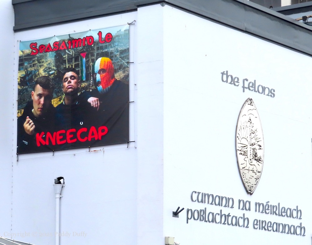 This tarp is on the Felons’ Club/Cumann Na Méırleach Poblachtach Éıreannach, replacing Seas Leıs An Phalaıstín. See also Seas Le Kneecap on the Falls Road.
