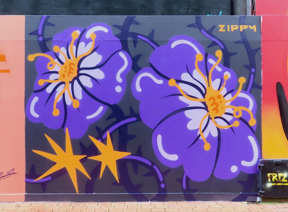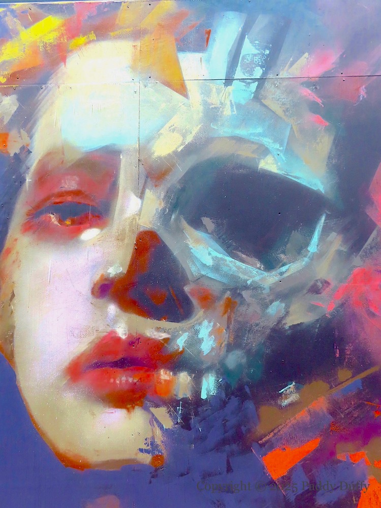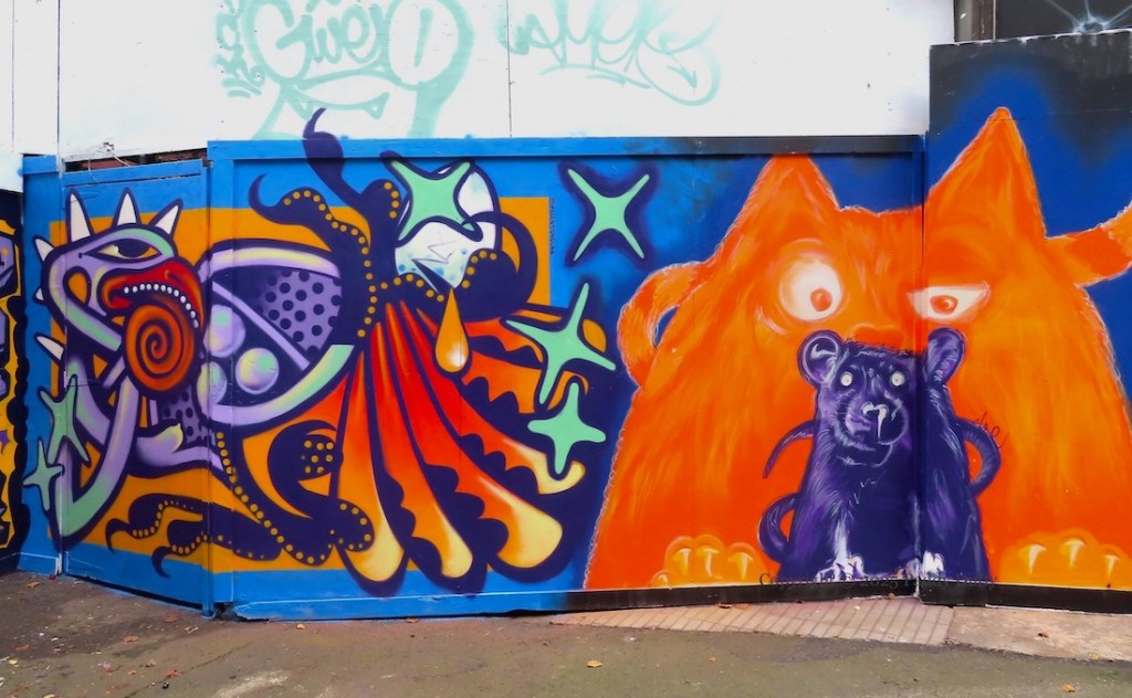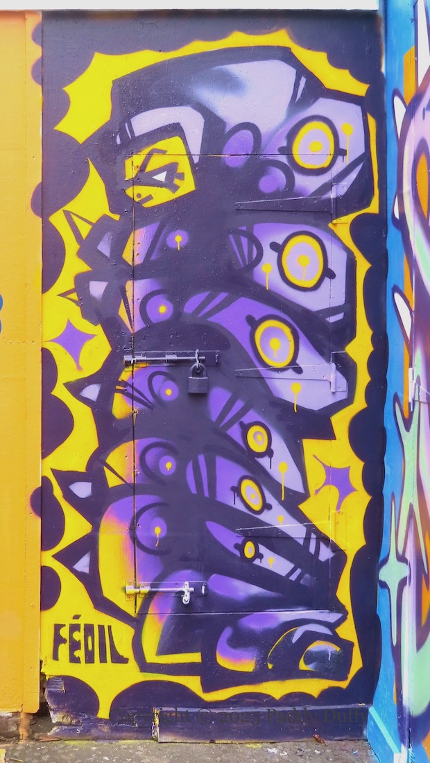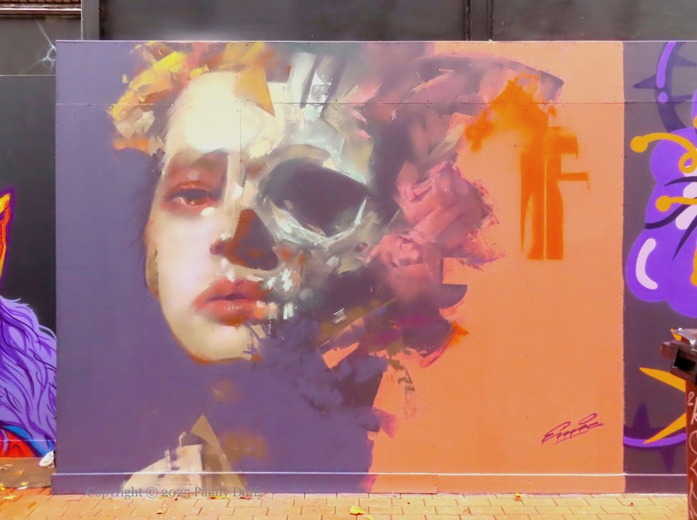 Culture Night Belfast returned after a three-year hiatus and included a paint-jam in three locations: on a hoarding in Garfield Street (this page), on junction boxes (and one doorway) in Royal Avenue, and on shutters (and one junction box) in North Street.