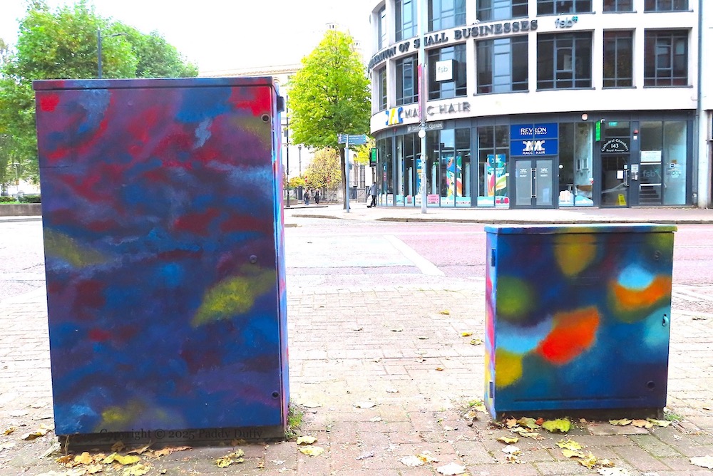 Culture Night Belfast returned after a three-year hiatus and included a paint-jam in three locations: on junction boxes (and one doorway) in Royal Avenue (this page), on a hoarding in Garfield Street, and on shutters (and one junction box) in North Street.