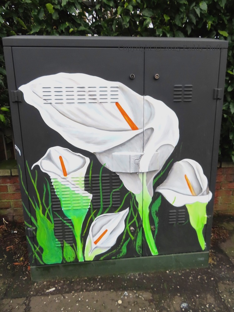 These Easter lilies are on a junction box on the Springfield Road at New Barnsley Park, west Belfast, and across the street from the boxes seen in Bóthar Chluanaí and Gaırdín Na hÉıreann.